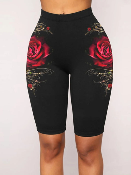Yoga Shorts Women Casual Rose Print Shorts High Waist Skinny Knee-length Legging Fitness Workout Female Leggings