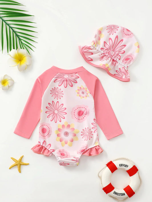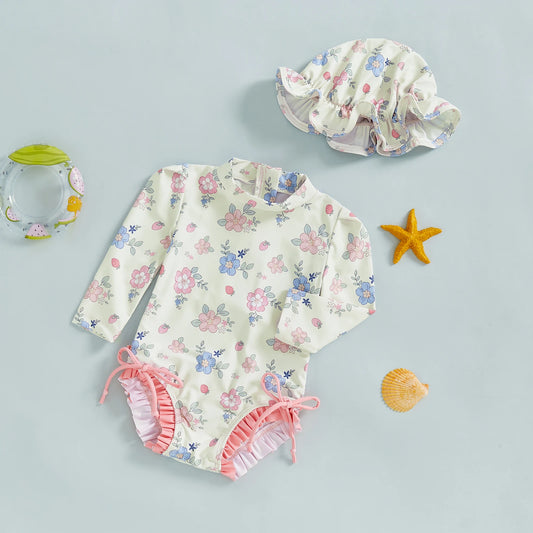 Baby Girl Summer Cute Flower Long Sleeve Onesie Swimsuit with Sun Hat Infant Swimming Suit with UV Protection