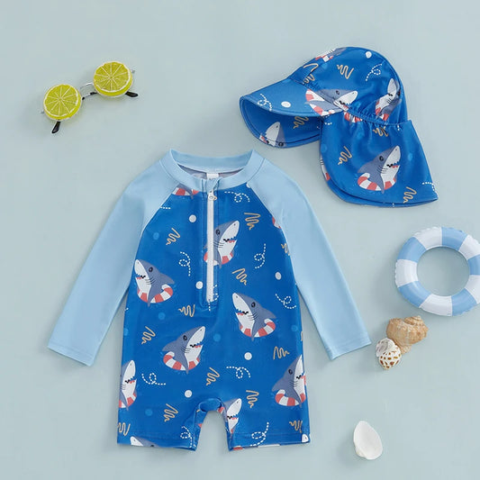 Toddler Boy Long Sleeve Swimsuit Shark Print Half Zipper Non-Pilling Rash Guard Swimwear Sunhat Set