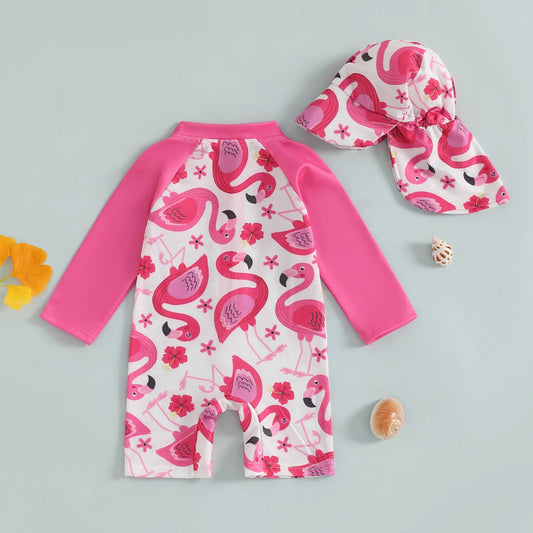 Toddler Girl Rash Guard Swimwear Sunhat 2Pcs Bathing Suit Set Infant Long Sleeve Swimsuit Flamingo Print Half Zipper Beachwear