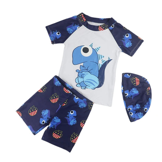 Dinosaur Pattern Kids Boys 3 Pieces Swimsuit Rash Guard With Cap Short Sleeve Swimming Set Bathing Suit for 0-6 Years