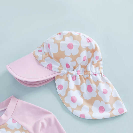0-4Y Summer Kid Girl Romper Swimsuit 2pcs Long Sleeve Ruffles Flowers Printed Zipper Beach Swimwear + Hat