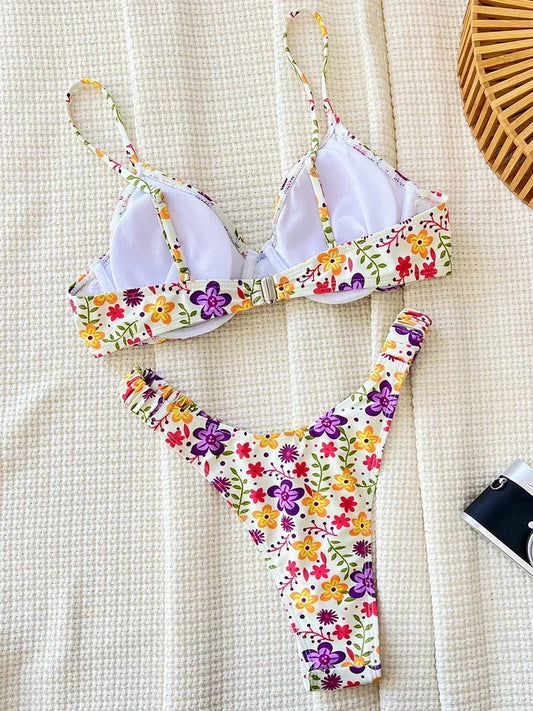 Flowers Printed Underwired High Cut Bikini Female Swimsuit Women Swimwear Two-pieces Bikini Set Push Up Bathing Suit Swim Lady