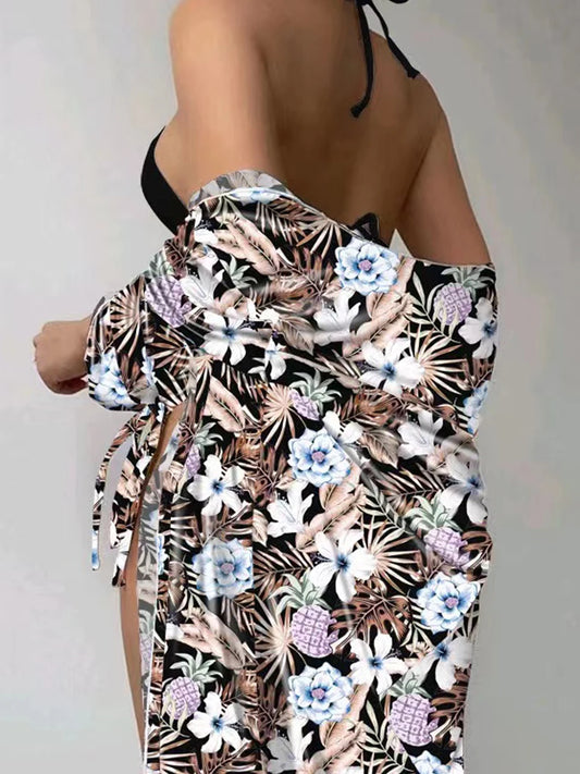 Lace Up Bikinis & Cover Up Long Sleeve Swimwear Women 3-Piece Print Swimsuit Summer Beach Bathing Suit Female Swimming Wear