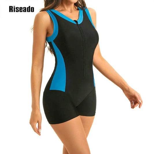 Athletic Women's Boyleg One Piece Swimsuit Knee Length Zip Front Sports Bathing Suit Big Size