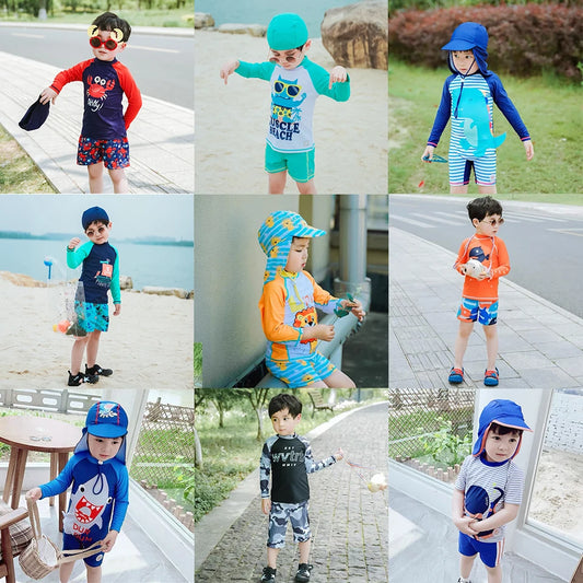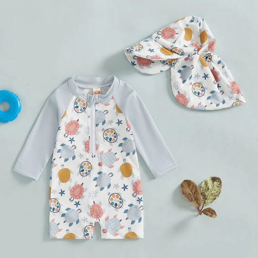 Long Sleeve Kids Baby Boys Swimsuits with Hats Cute Cartoon Fish/Turtle Print Children Swimming Suit Beach Wear