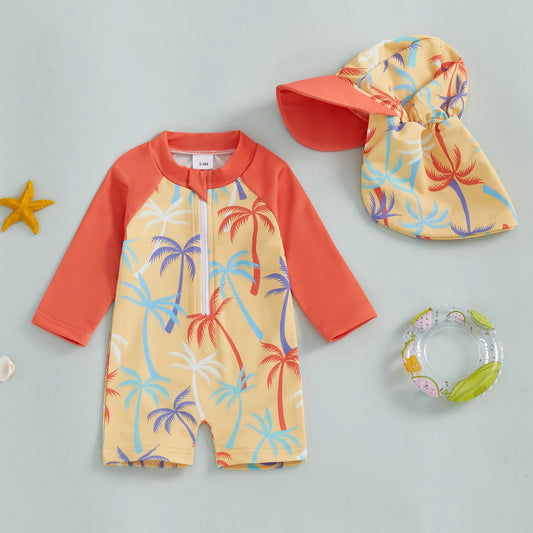 Toddler Baby Boys Long Sleeve Swimwear Rash Guard with Swim Cap Summer Coconut Tree Print Swimsuit Bathing Suit Zip Beachwear