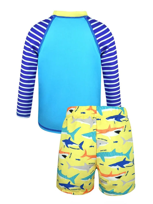 Boy Kids Swimsuit Cartoon Shark Striped Long Sleeves Children Swimwear Summer Two Piece Beachwear Bathing Suit Swimming
