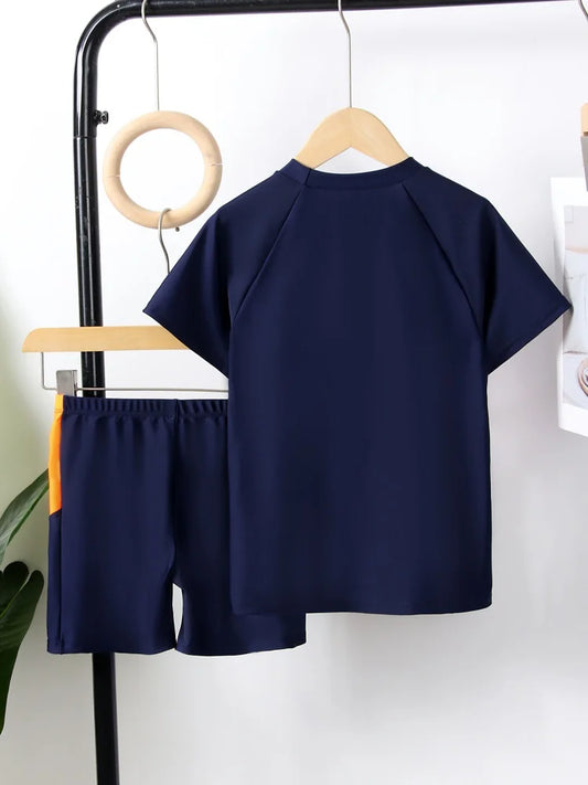 Boy Kids Swimsuit Solid Letter Short Sleeve Children Swimwear Summer Two Piece Shorts Beachwear Bathing Suit Swimming