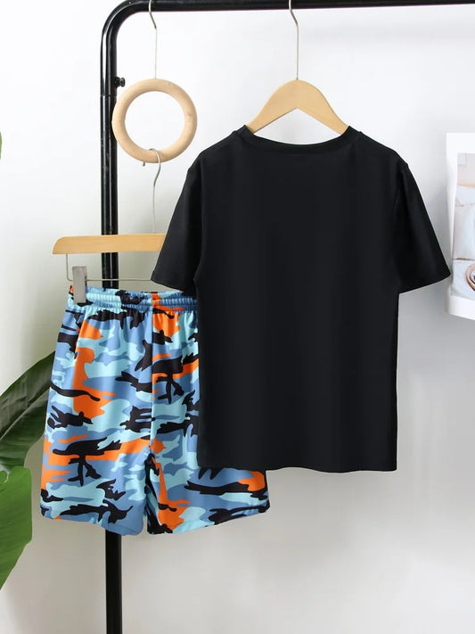 Boy Kids Swimsuit Black Short Sleeve Children Swimwear Summer Beach Shorts Two Piece Beach Wear Bathing Suit Swimming