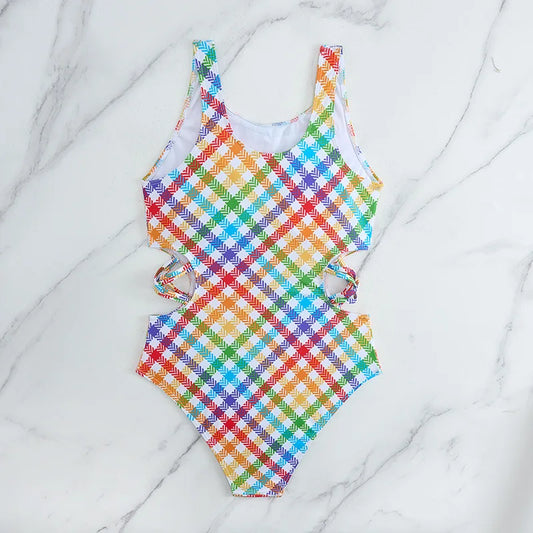 Girls Swimsuit One Piece Rainbow Plaid Kids Swimwear Children's Bathers Bathing Swimming Swim Suit Summer Beachwear
