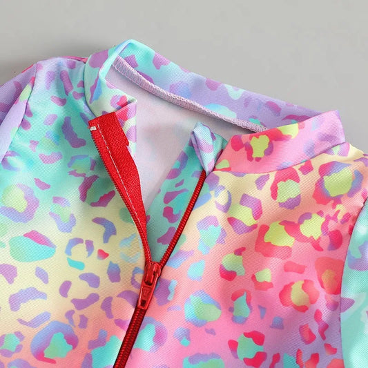 One Piece Girls Swimsuit Solid Print Long Sleeves Zipper Kids Swimwear Bodysuit Children Bathing Suit Beach Wear Summer