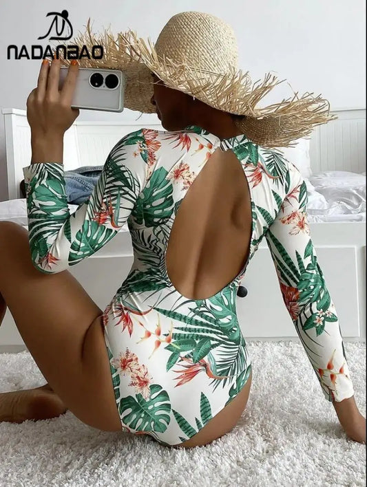 NADANBAO One piece Tropical Print Women Long Sleeve Swimwear