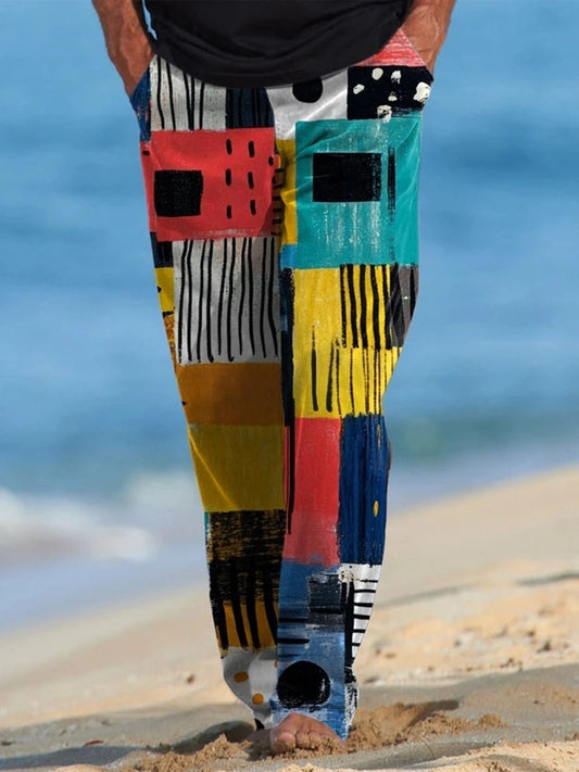 Men's Casual Summer Trousers Colorful Patchwork Print Drawstring Lightweight Elastic Waist With Pockets Relaxed Fit Pants