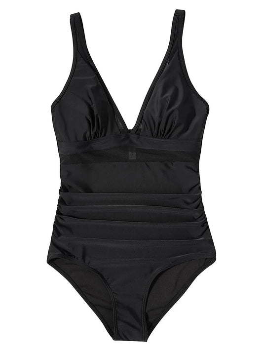 Black Mesh Solid Swimsuit Women One Piece Swimwear Female Strappy Bodysuit Bathers Bathing Swimming Swim Suit Beachwear