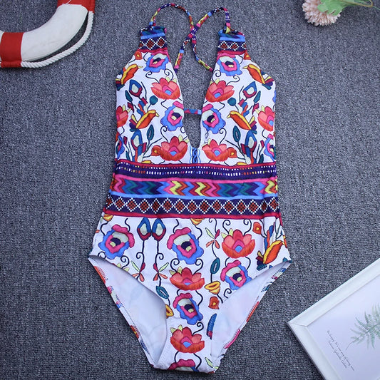 Women Vintage Backless One Piece Swimwear Woman Swimsuit Deep V Summer Beachwear Print Slimming Bathing Suit Femme