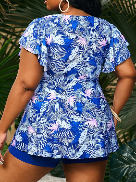 Tropical Print Butterfly Sleeve Drawstring Swimsuit Women Plus Size Swimwear Female Bathers Bathing Swimming Suit Summer