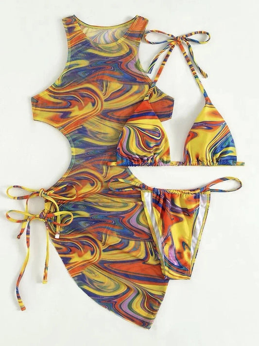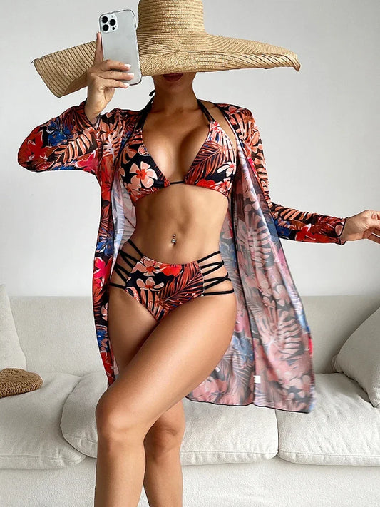 3 Piece Print Halter Triangle Bikini Sets Women Cover Up Swimwear Summer Swimsuit Female Bathing Swimming Suit Beachwear