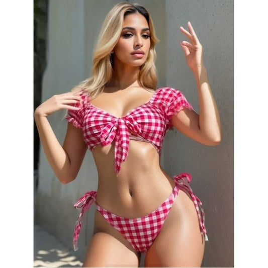 Checkered Two-Piece Swimsuit Bikini Girl Plaid Tie Swimwear Beach Vacation Swimsuit for Women