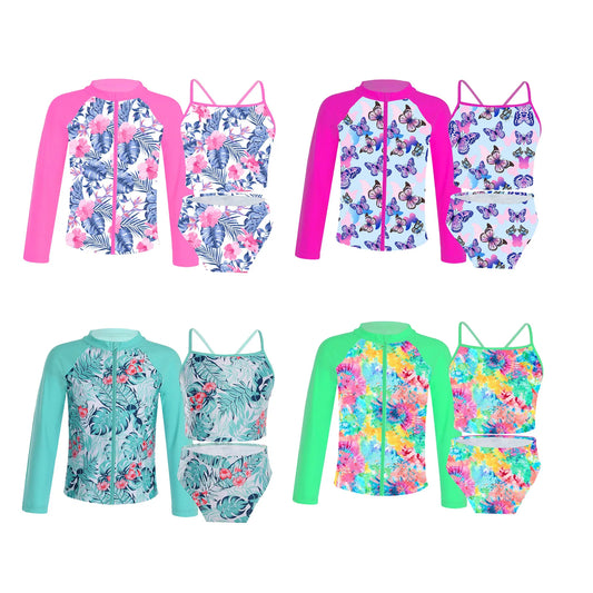 3PCS Kids Girls Swimsuits Beachwear Floral Printed Zippered Long Sleeve Coat with Bikini Briefs Swimsuit Swimwear Bathing Suits