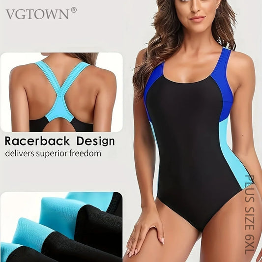 Plus Size 6XL Women One-Piece Sports Swimwear Patchwork Racerback Swimsuit Wide Straps Surfing Bathing Suit