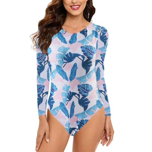 one-piece swimsuit long-sleeved leaf print back zipper surf suit sun protection women's swimsuit bathers