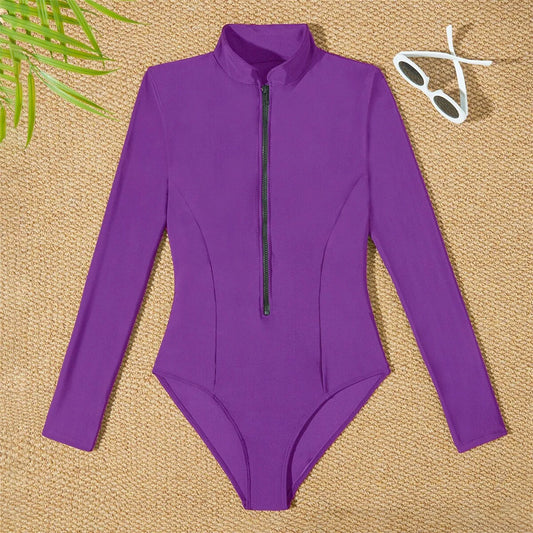 One-piece Swimsuit Women Long Sleeves Sunscreen Surf Wear Solid Color Stitching Zipper Conservative Summer Beach Swimwear
