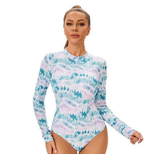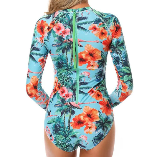 Women Print Long Sleeve One Piece Swimsuit Zipper Swimwear Bathing Suit Beach Wear Vintage Bodysuit Surfing Swim Suits