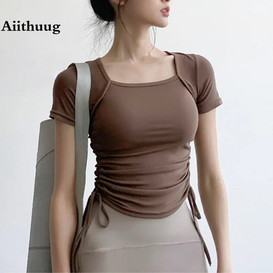Aiithuug Yoga Shirts Drawstring Yoga Tops Gym Shirt Workout Top Fitness Crops Yoga Crop Top Sports Active Wearing Short Sleeve