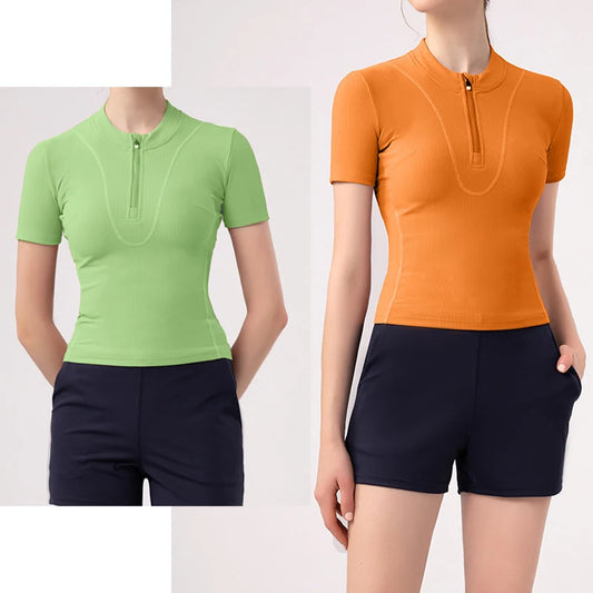 Aiithuug Women Slim Fit Gym Shirts Half Zip Workout Tops Quarter Zip Fitness Shirt Running Quicky Dry Short Sleeve Yoga Tops