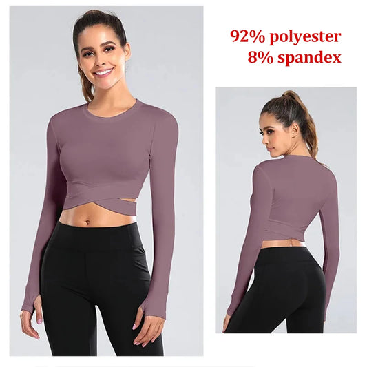 Aiithuug Miidriff Long Sleeve Yoga Tops Sports Fitness Crop Top Gym Shirts Slim Fit Running Tank Tops Criss Cross Waist Cross