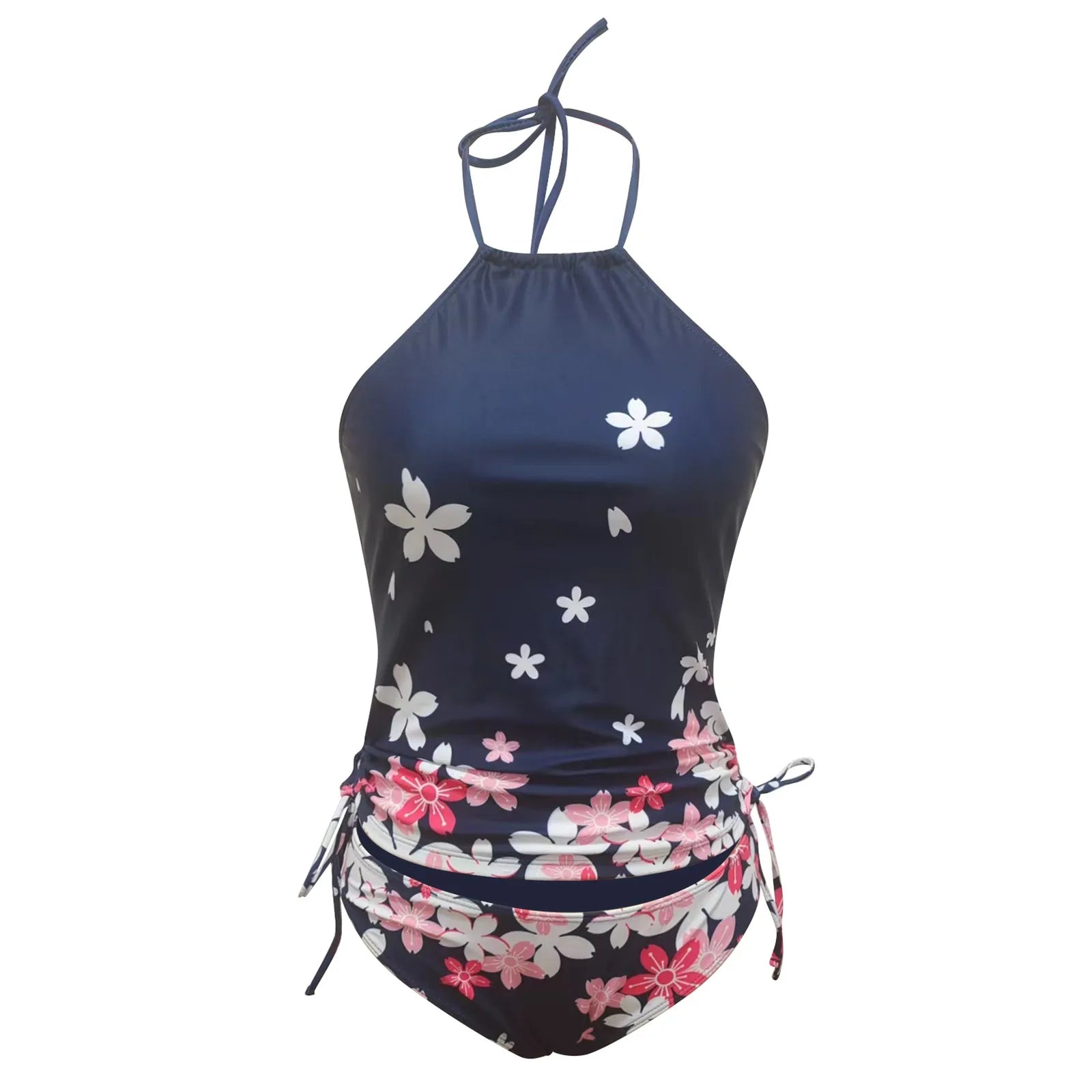 2 PC Tankinis Women Slim Fit Floral Printed Casual Swim Tops With Swim Pants Summer Drawstring Backless Conservative Swimwear