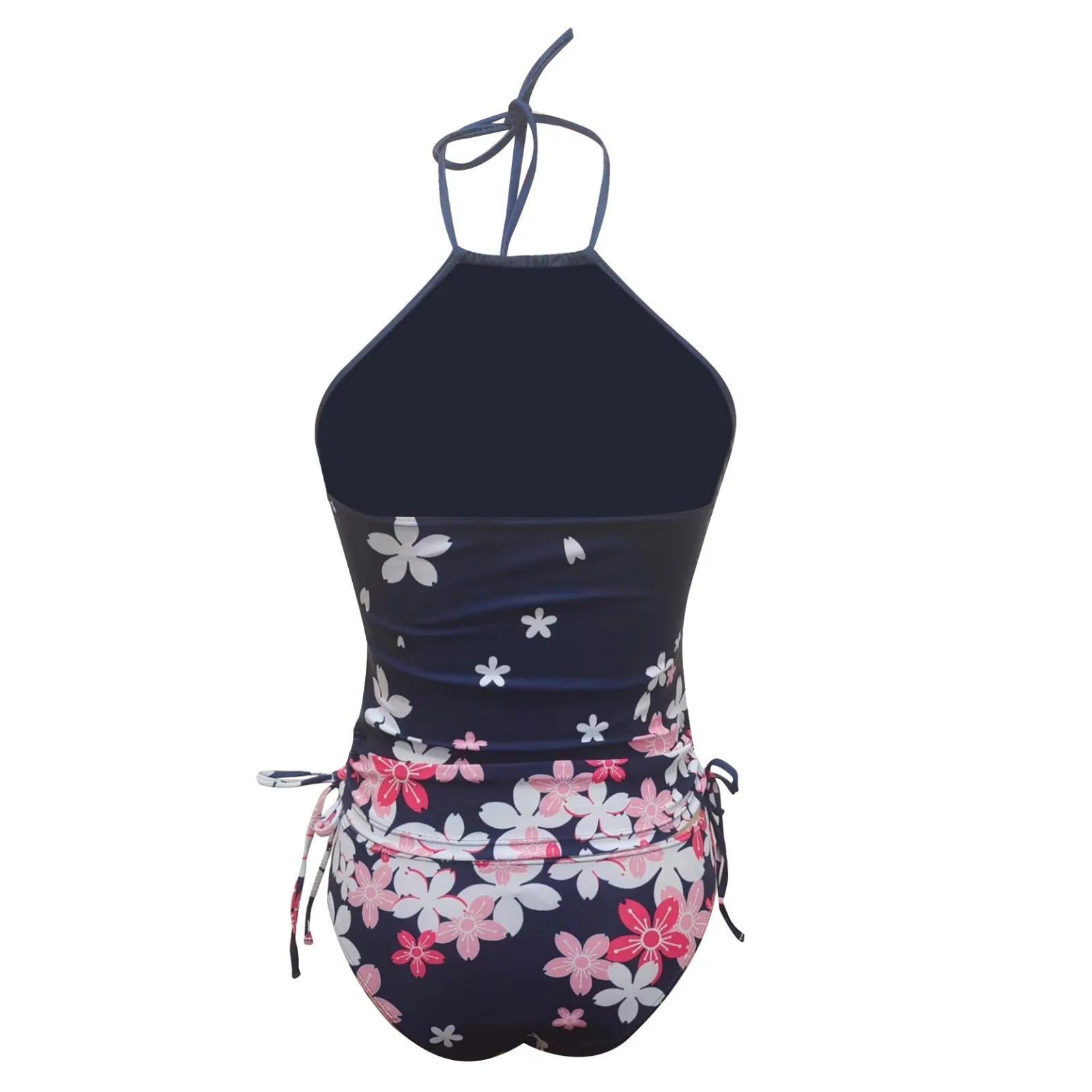 This 2-piece tankini set features slim-fit floral printed swim tops paired with coordinating swim pants, designed for both style and comfort. The drawstring backless detail allows for an adjustable, secure fit, while the conservative cut offers confidence during your summer swim activities. Ideal for casual beach days or poolside relaxation, this swimwear combines tasteful coverage with elegant, feminine design.