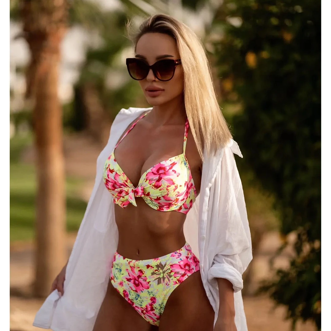 This leaf print bikini set combines style and support with a push-up design and high-waist bottoms for a flattering fit. Crafted for comfort and confidence, the thong cut enhances your silhouette while the vibrant leaf pattern adds a fresh, natural touch. Ideal for swimming or sunbathing, this swimsuit balances fashion and function for your beach or poolside wardrobe.