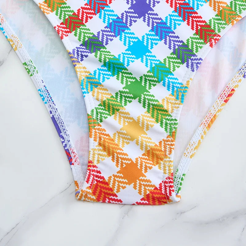 This one-piece swimsuit is perfect for your little beachgoer. The colorful rainbow plaid design adds a fun touch to this comfortable and durable swimwear. With great coverage and a secure fit, your child will be ready for a full day of swimming and sun.