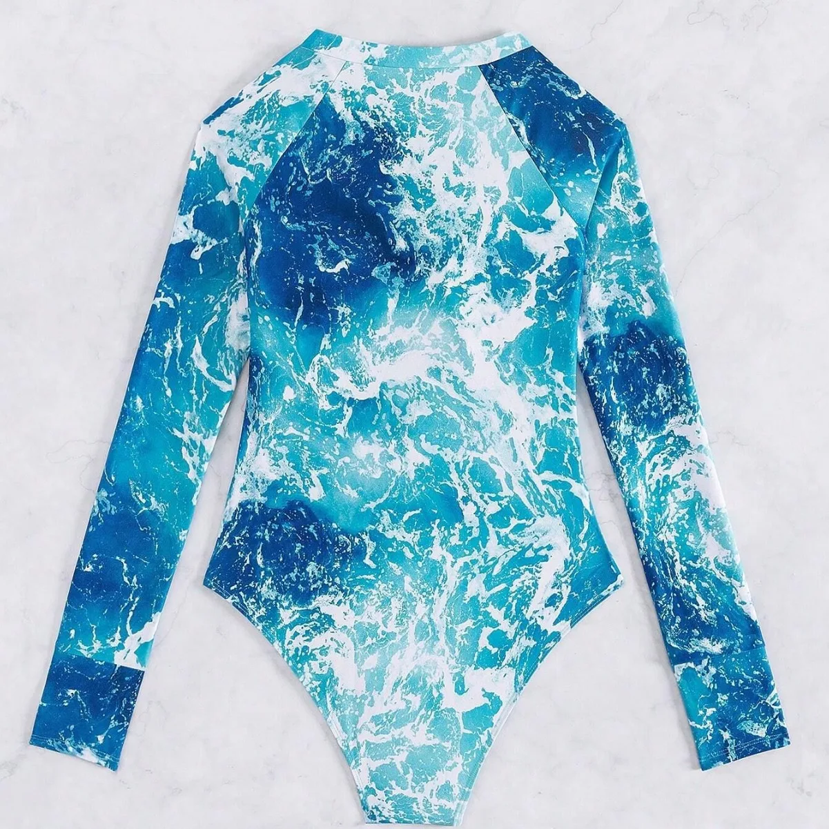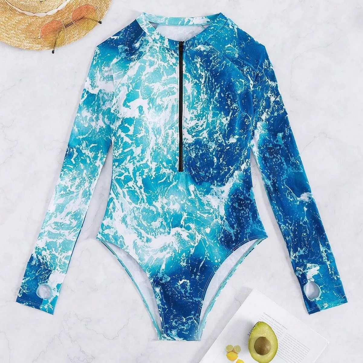 This versatile one-piece swimsuit combines style with practical sun protection, featuring long sleeves and a contemporary printed design. The front zipper allows easy entry and exit, while the durable fabric offers UPF coverage ideal for extended water activities. Whether you're surfing, diving, or enjoying hot spring relaxation, this suit delivers comfort and functionality. The streamlined cut provides excellent mobility in water, making it equally suitable for fitness swimming or casual beach days. A reliable choice for swimmers seeking comprehensive coverage without compromising on performance.