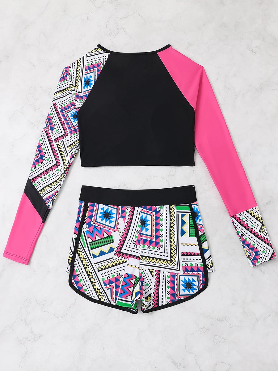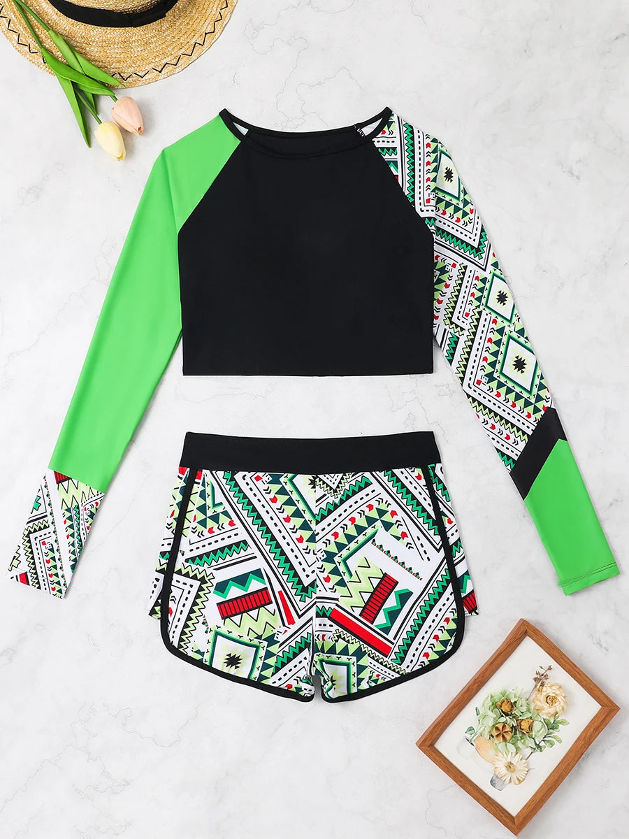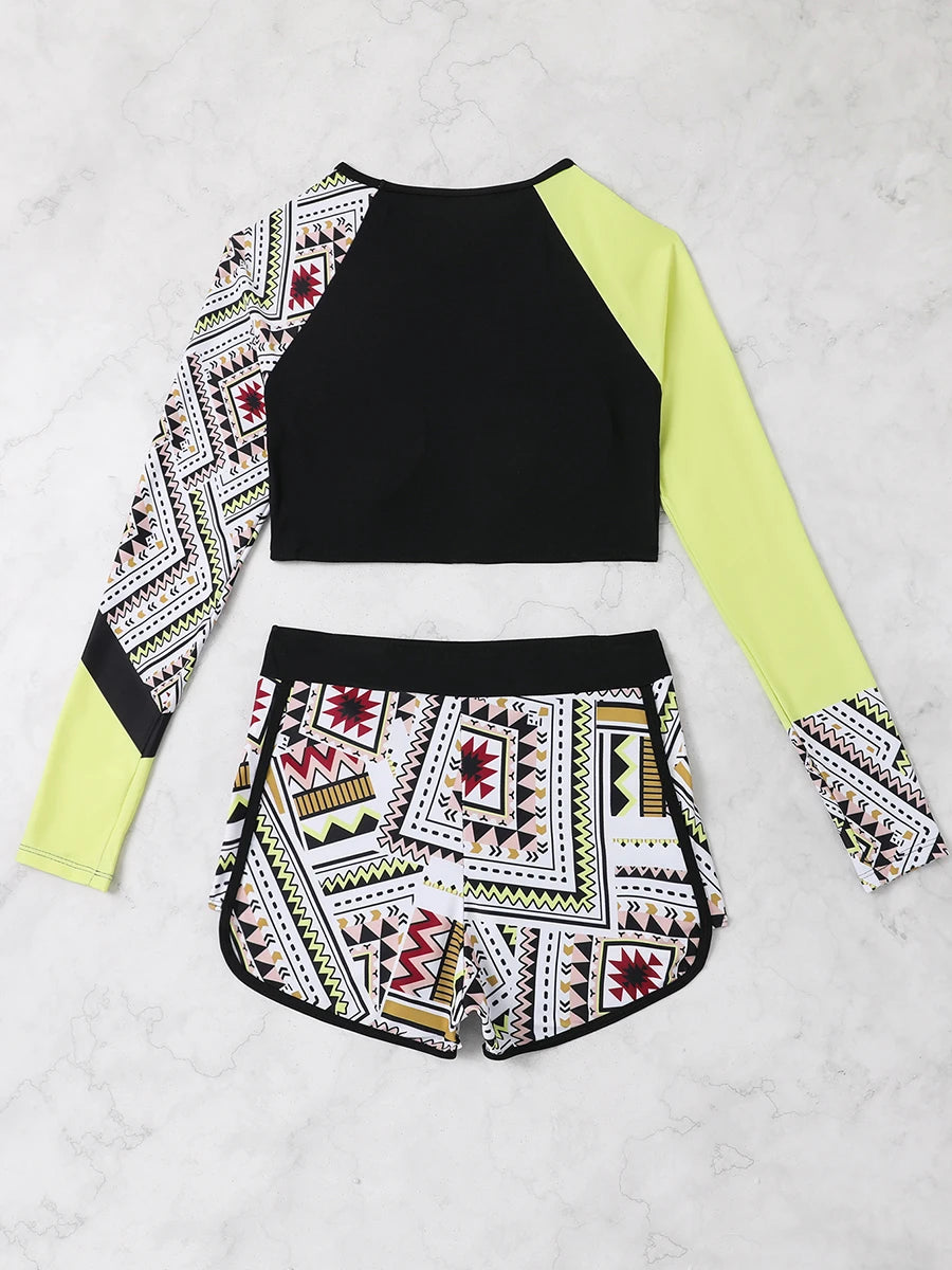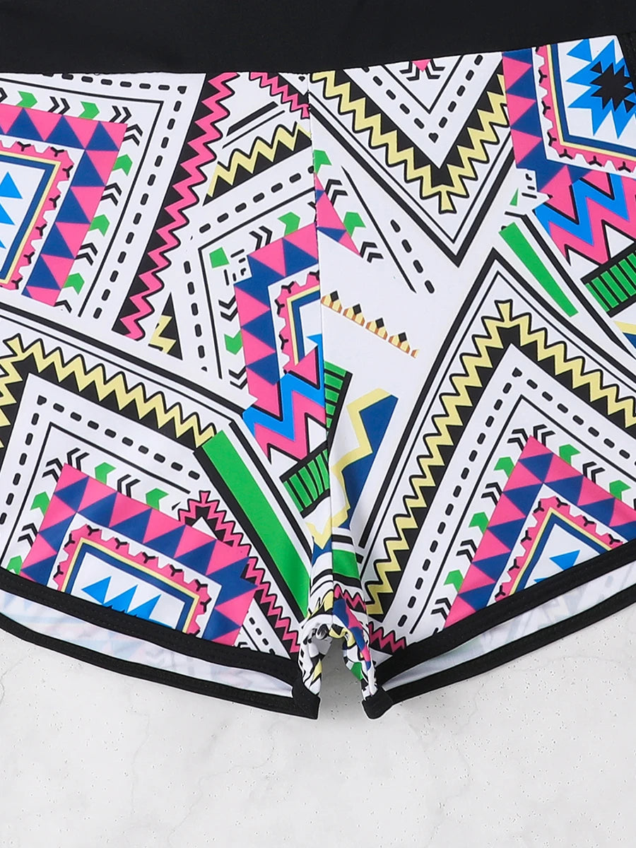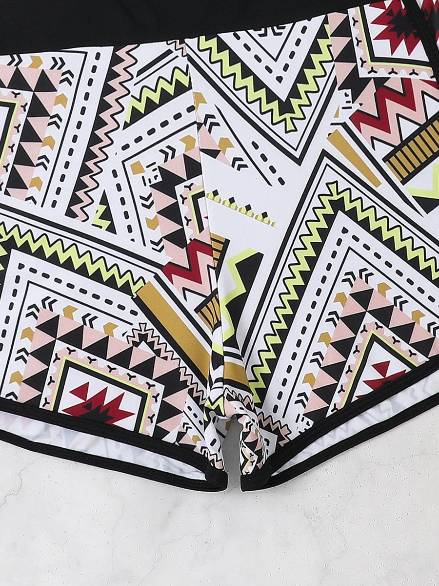 This two-piece women's swimsuit features a stylish printed design with high-waist shorts, offering both comfort and coverage ideal for surfing and active beachwear. Crafted for durability and freedom of movement, it supports a confident swim or surf session while maintaining a flattering fit. Perfect for bathing, swimming, or any water sport, this swimwear combines functionality with modern style.