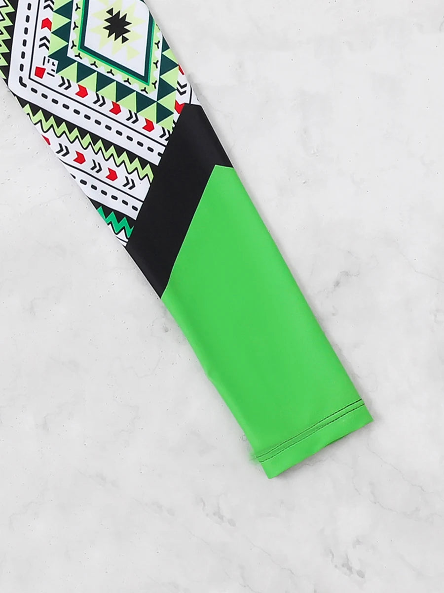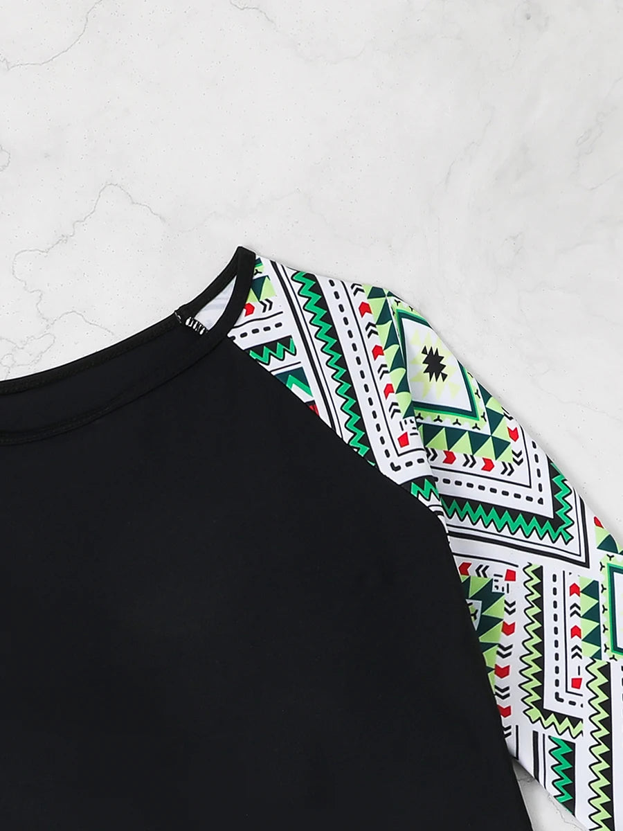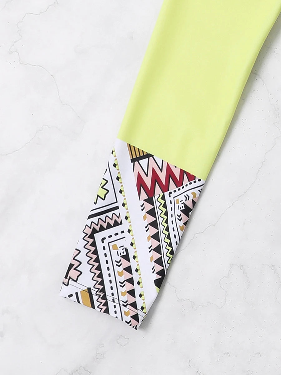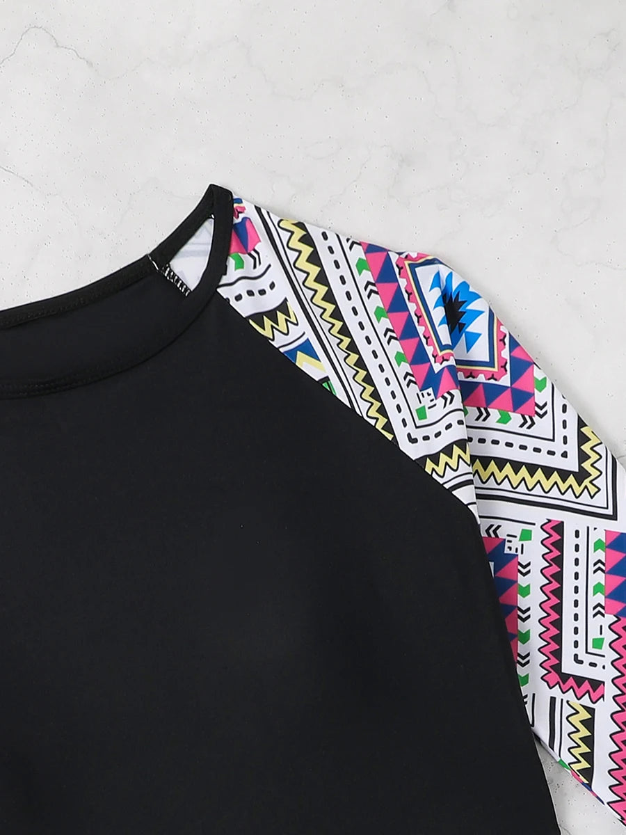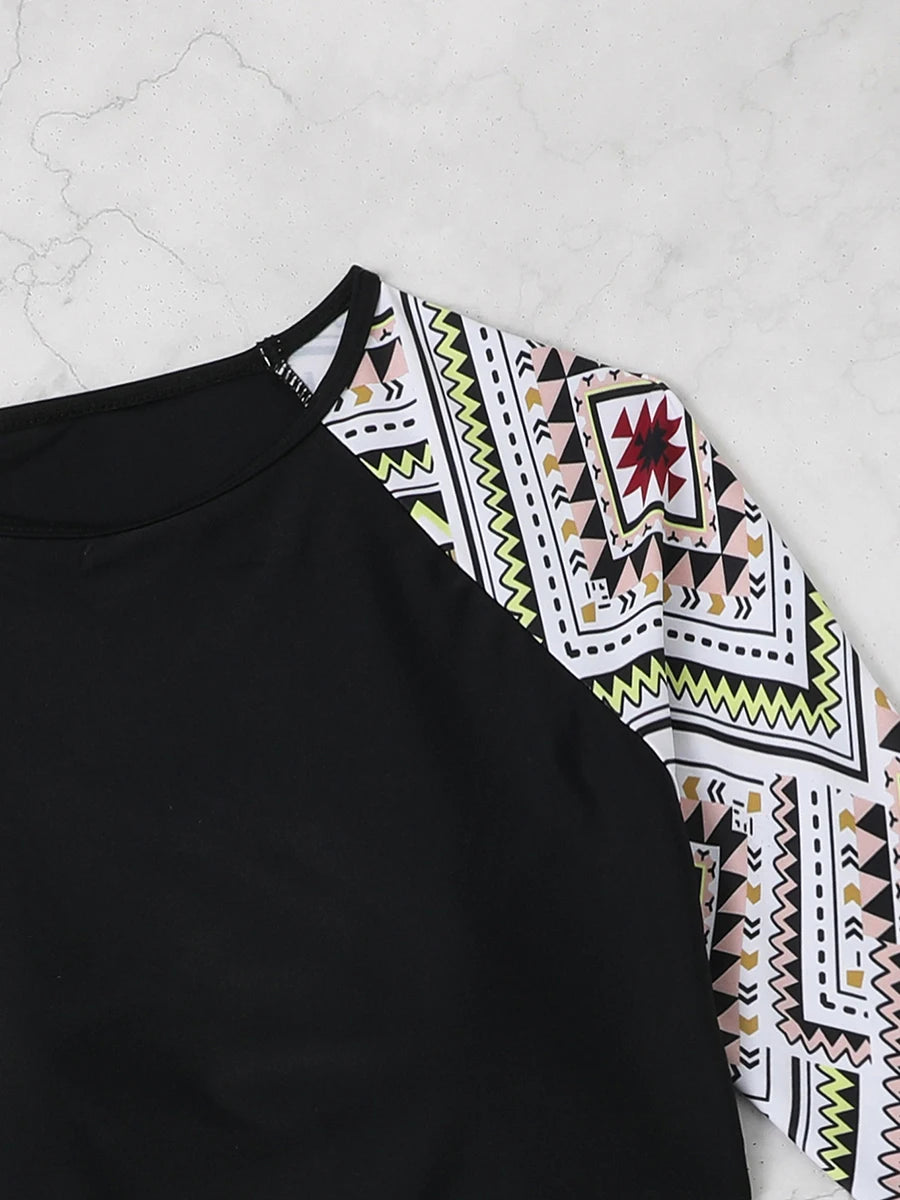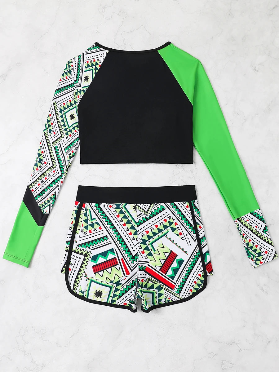 This two-piece women's swimsuit features a stylish printed design with high-waist shorts, offering both comfort and coverage ideal for surfing and active beachwear. Crafted for durability and freedom of movement, it supports a confident swim or surf session while maintaining a flattering fit. Perfect for bathing, swimming, or any water sport, this swimwear combines functionality with modern style.