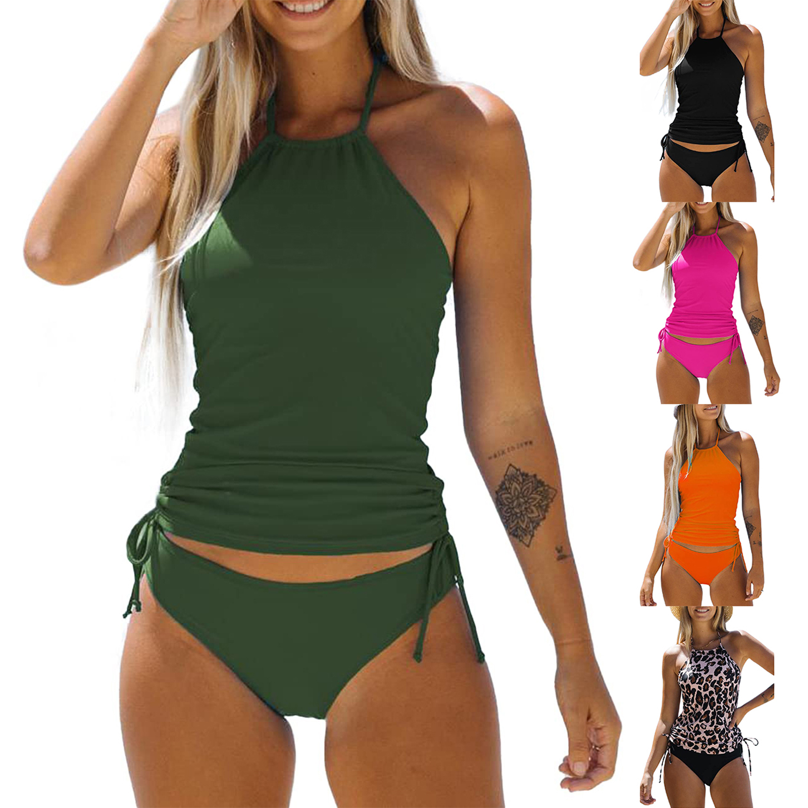 Womens Swimsuit Neck Hanger Sleeveless Backless Crop Tops Solid Color Panties Bathing Suit Beachwear for Female