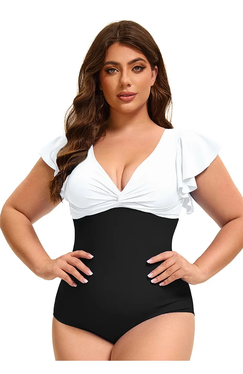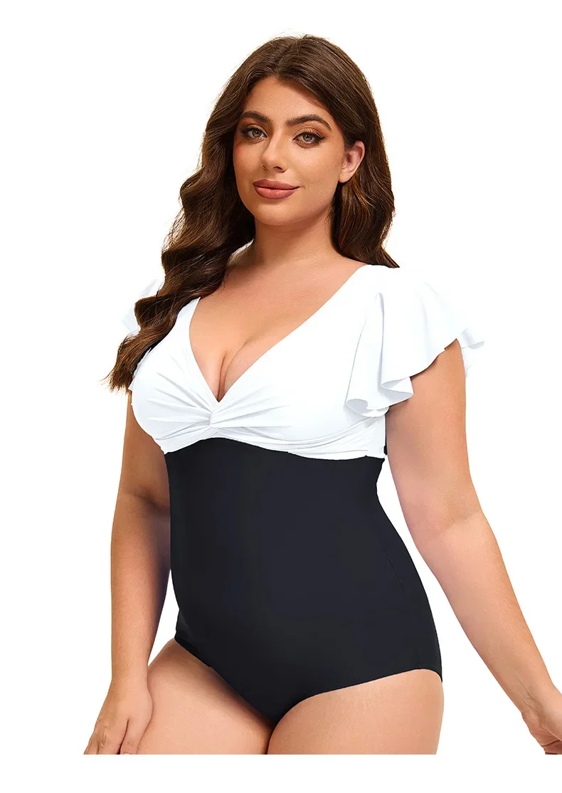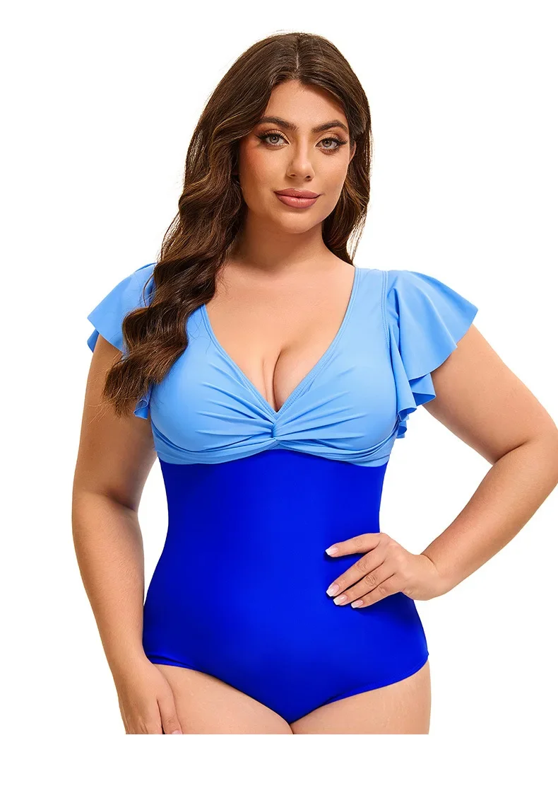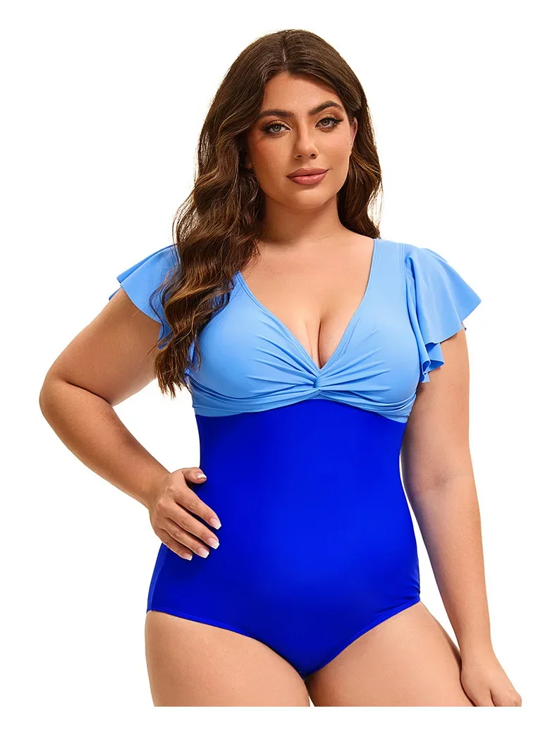 This plus size one-piece swimsuit combines style and comfort with its flattering color block design and elegant flounce sleeves. Available in sizes XL to 5XL, it offers a supportive fit that enhances your silhouette while allowing ease of movement. Ideal for confident swimming or relaxing poolside, this swimsuit delivers both fashion and functionality for a versatile swimwear option.