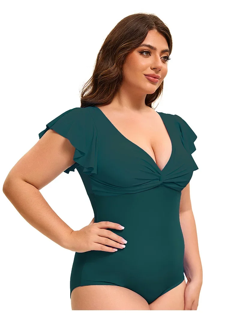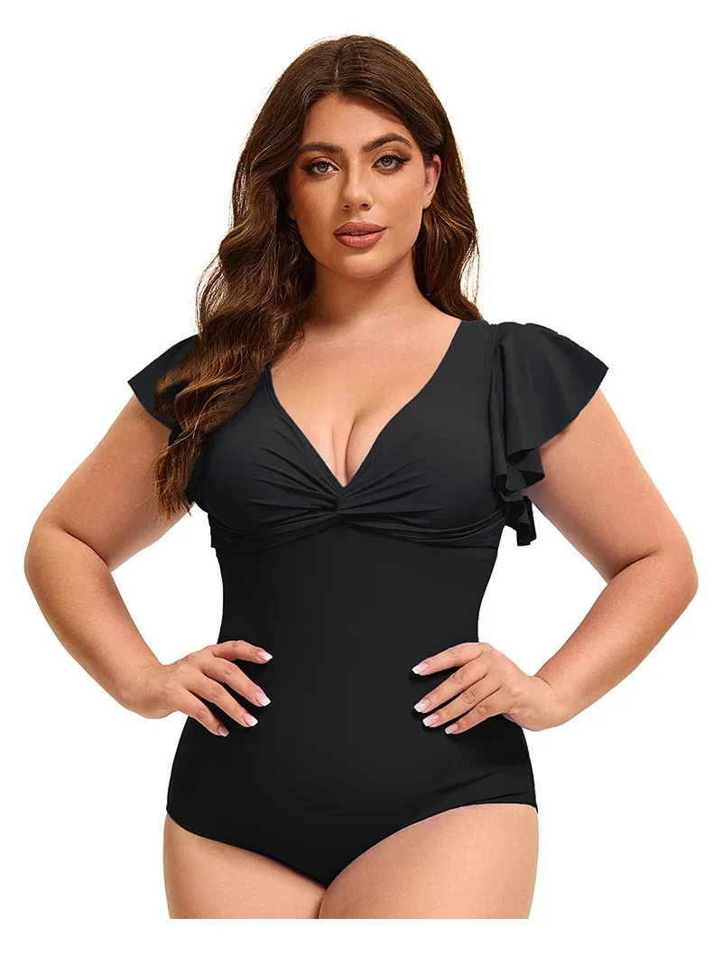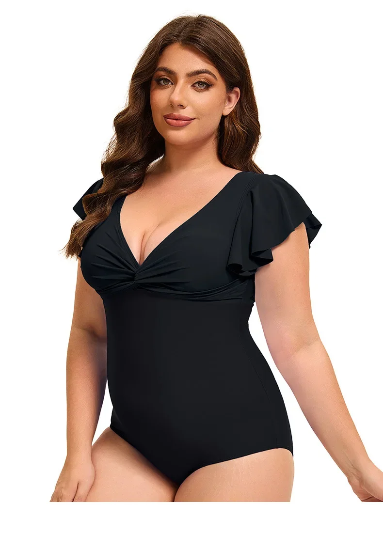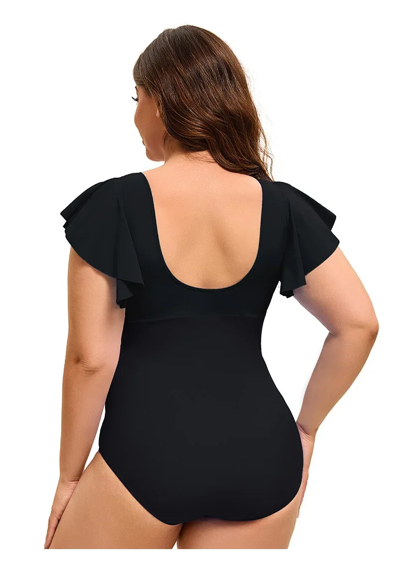 This plus size one-piece swimsuit combines style and comfort with its flattering color block design and elegant flounce sleeves. Available in sizes XL to 5XL, it offers a supportive fit that enhances your silhouette while allowing ease of movement. Ideal for confident swimming or relaxing poolside, this swimsuit delivers both fashion and functionality for a versatile swimwear option.