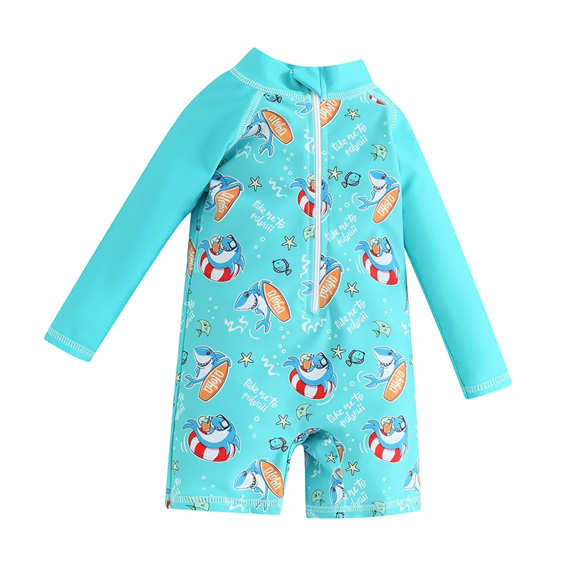 Keep your little one protected and comfortable in the water with this durable rash guard romper. Featuring a full-length zipper for easy dressing, long sleeves provide UV protection during extended water play. The engaging shark print design captures toddlers' imaginations while the stretchy, quick-drying fabric ensures freedom of movement. Ideal for beach days, pool sessions, or water sports activities, this one-piece swimsuit combines safety with style for active young swimmers.