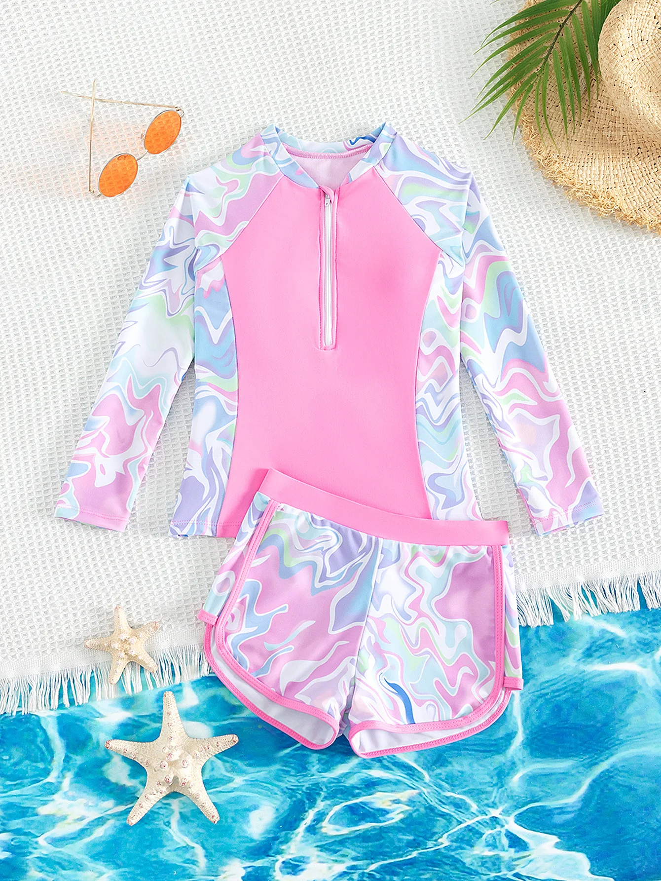 Designed for active young swimmers, this two-piece long sleeve swimsuit offers excellent sun protection and comfort for toddler girls. The long sleeves provide UPF coverage to shield delicate skin during water play, while the shorts-style bottom ensures freedom of movement and modest coverage. The coordinated set combines practicality with playful style, making it ideal for beach days, pool sessions, and water activities. Quality construction ensures durability through repeated wear and washing, keeping your little one protected and confident in the water.