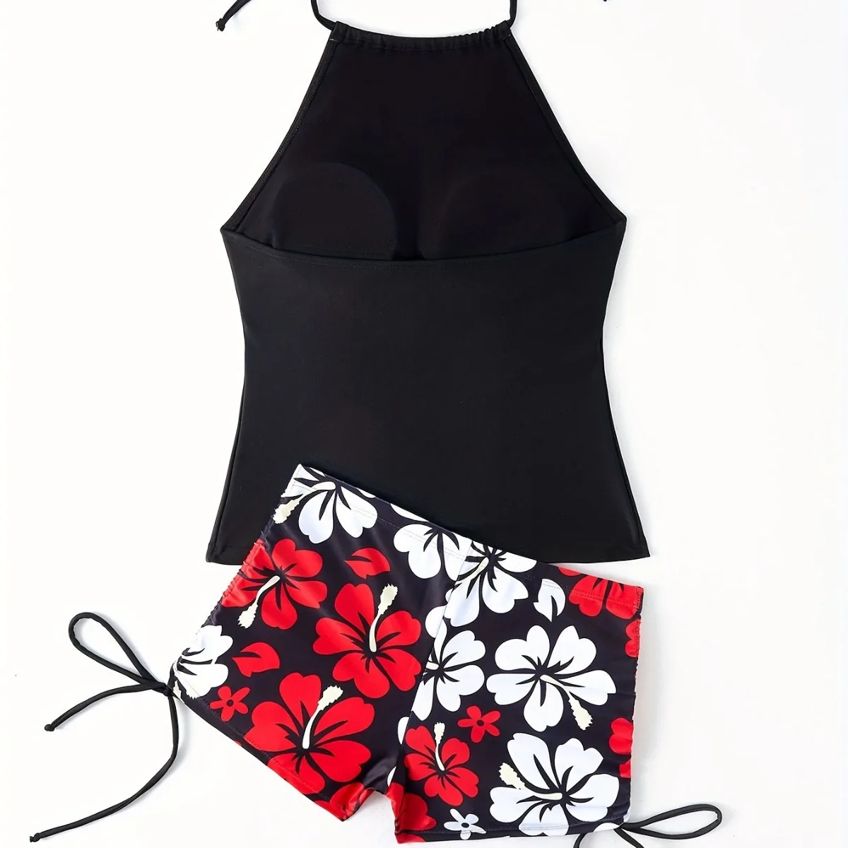 This two-piece women's swimwear set combines style and functionality, featuring a sleeveless tankini top with a backless design for maximum comfort and breathability. The set includes beach shorts and a versatile monokini style, ideal for swimming, sunbathing, or casual beachwear. Crafted for a flattering fit, it offers freedom of movement while maintaining a chic, modern look. Perfect for those seeking both coverage and elegance by the water.