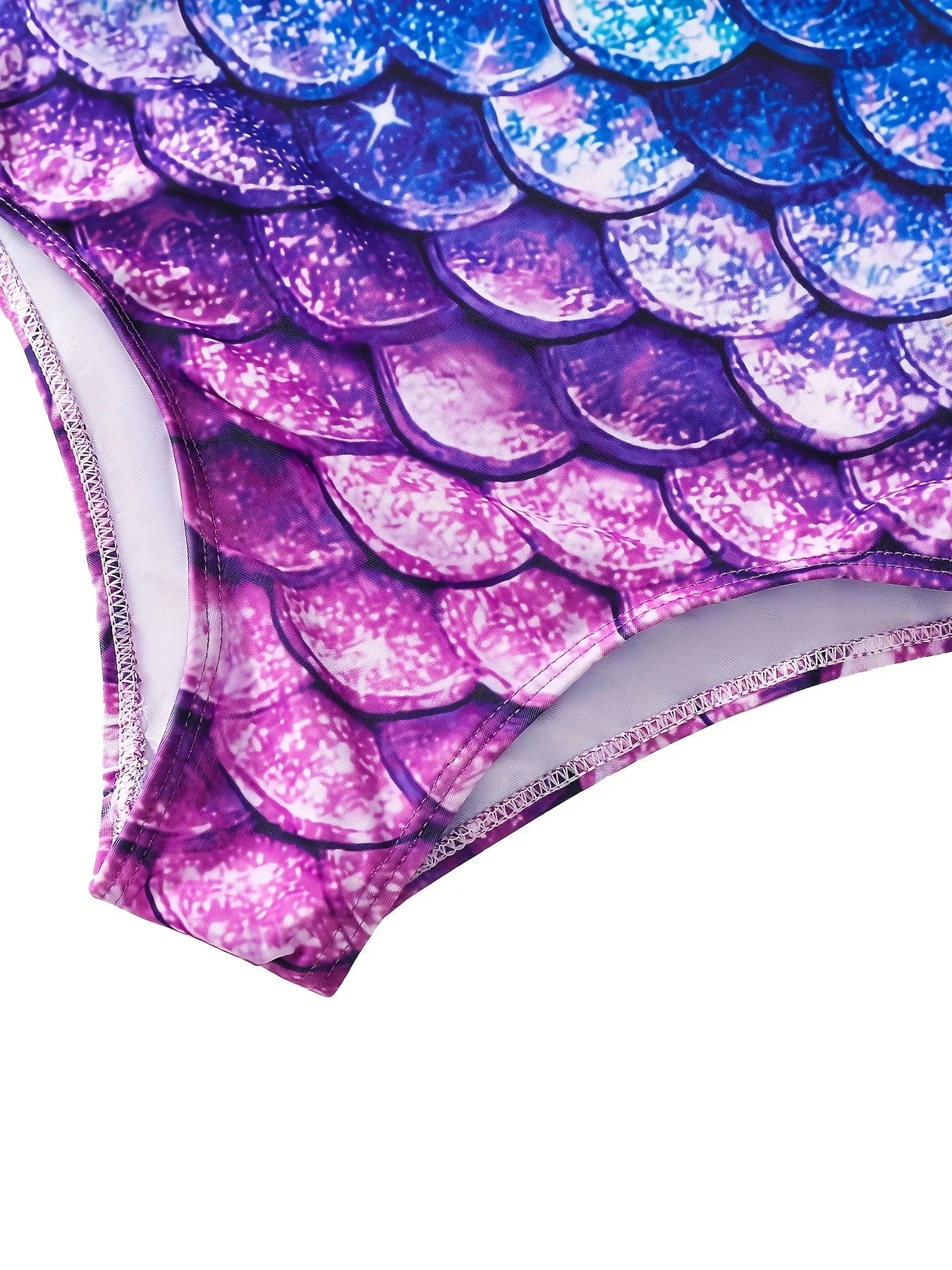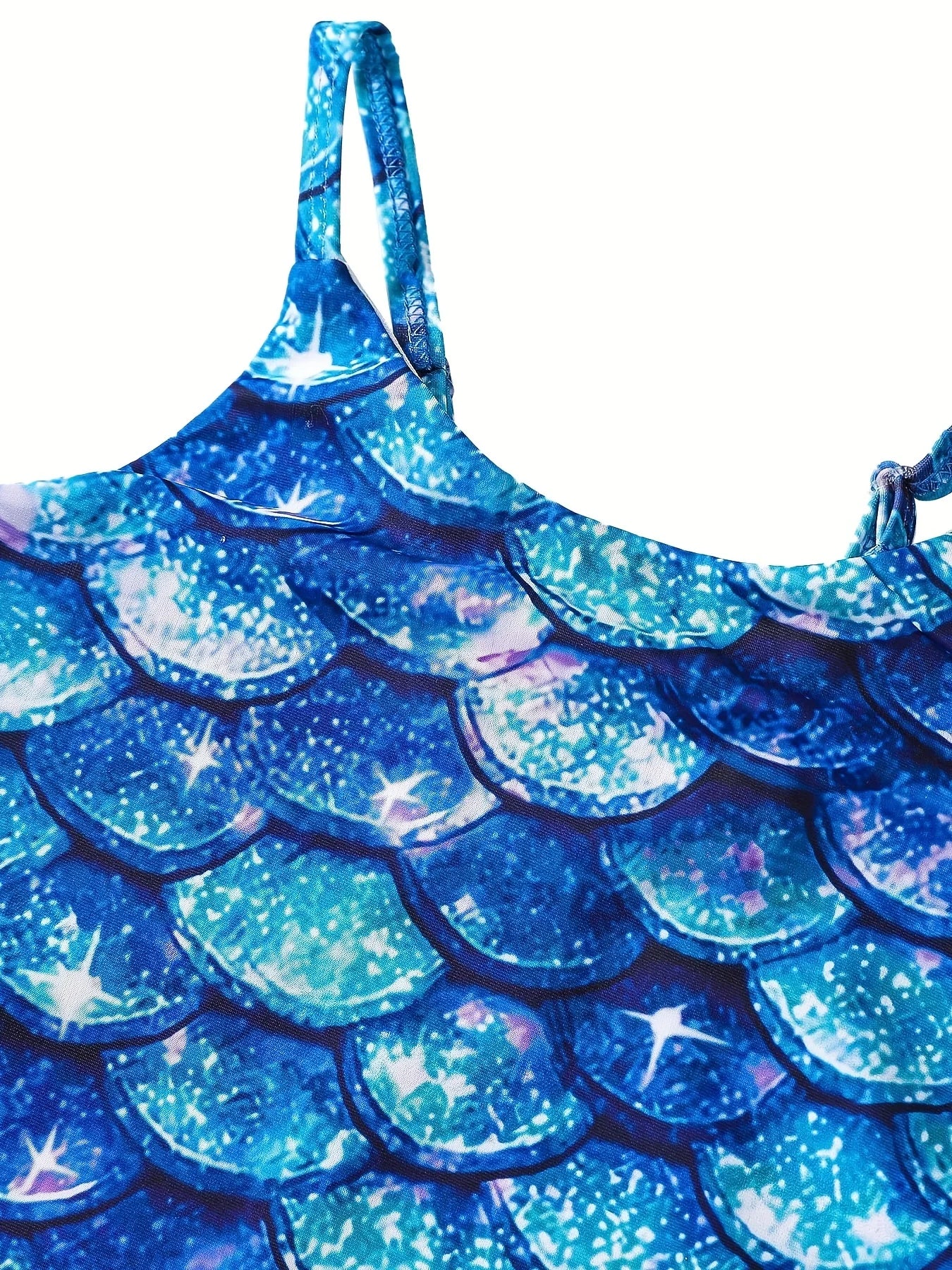 Bikini-cut Bottom Girls Swimsuit, One-Piece Sleeveless 3D Scale Print Swimwear, Beach Half Backless, Kids Ages 3-12 Swim, Summer