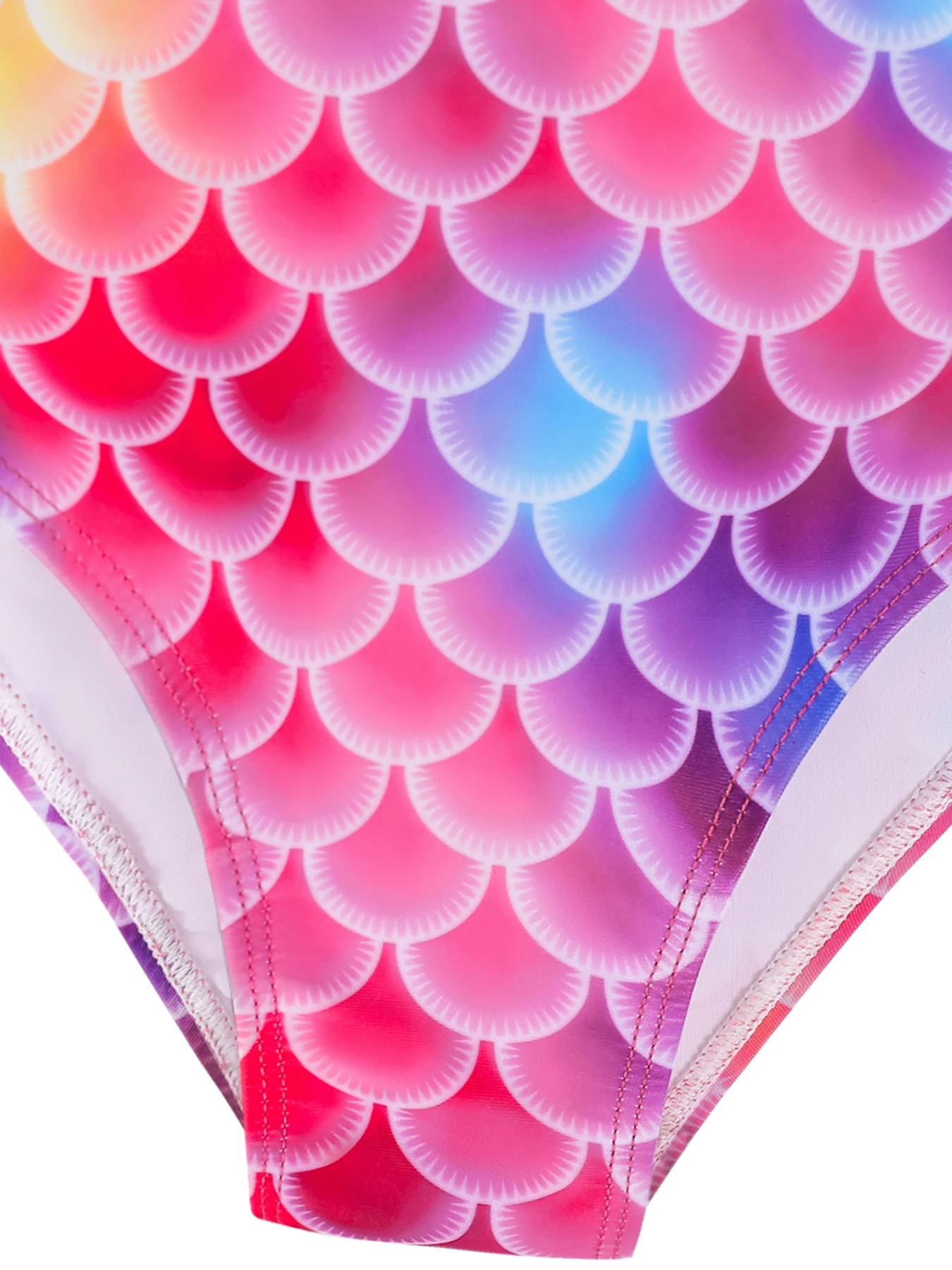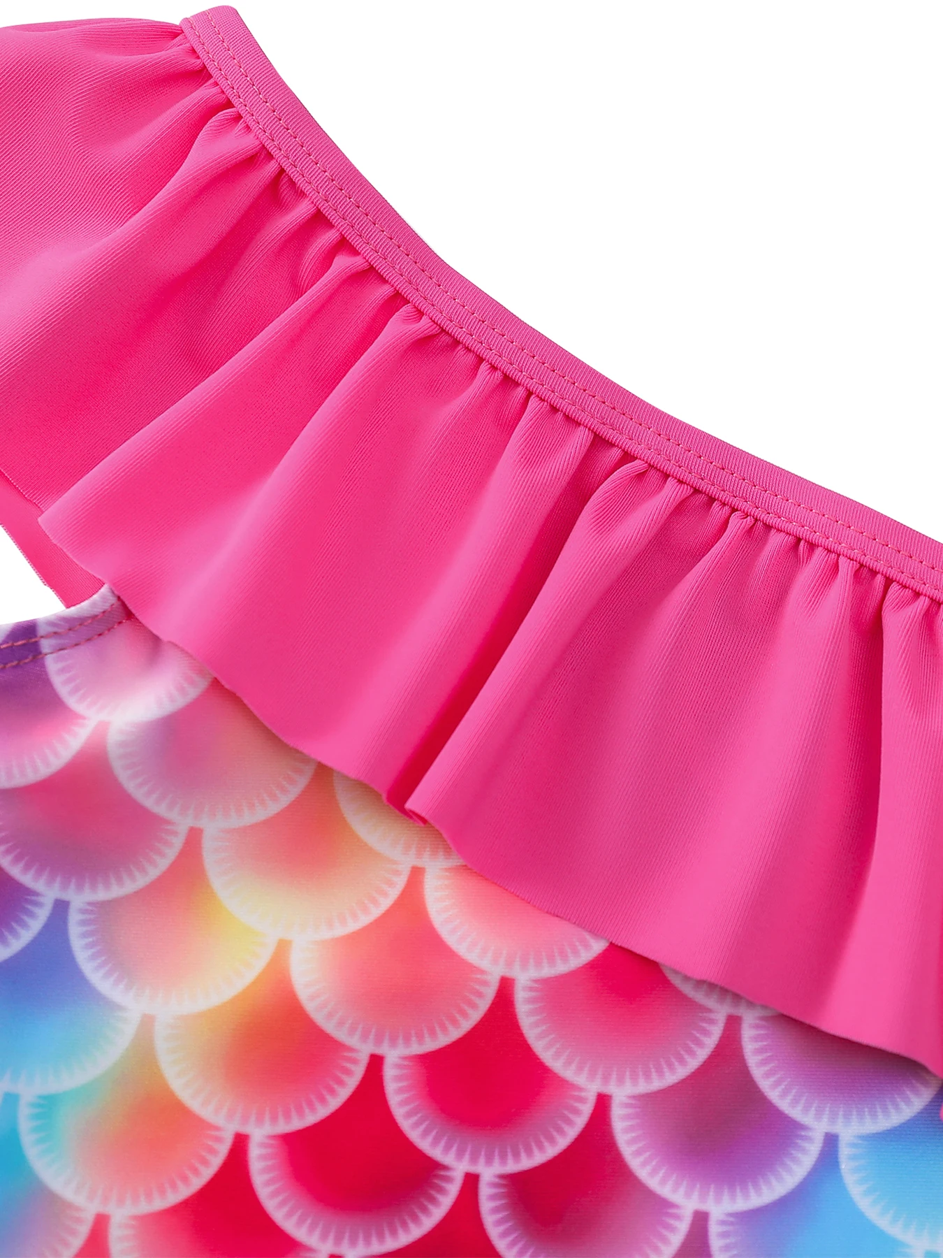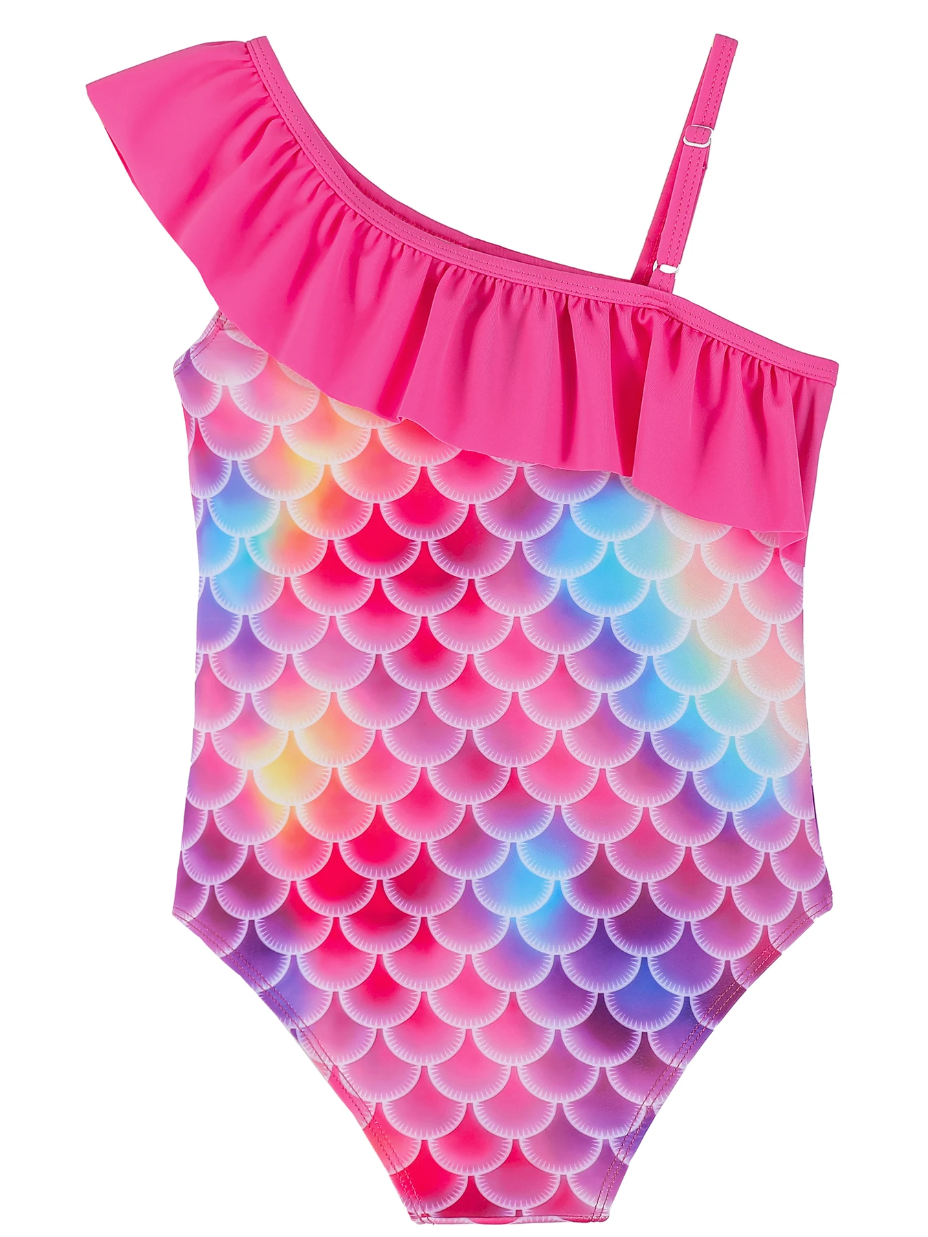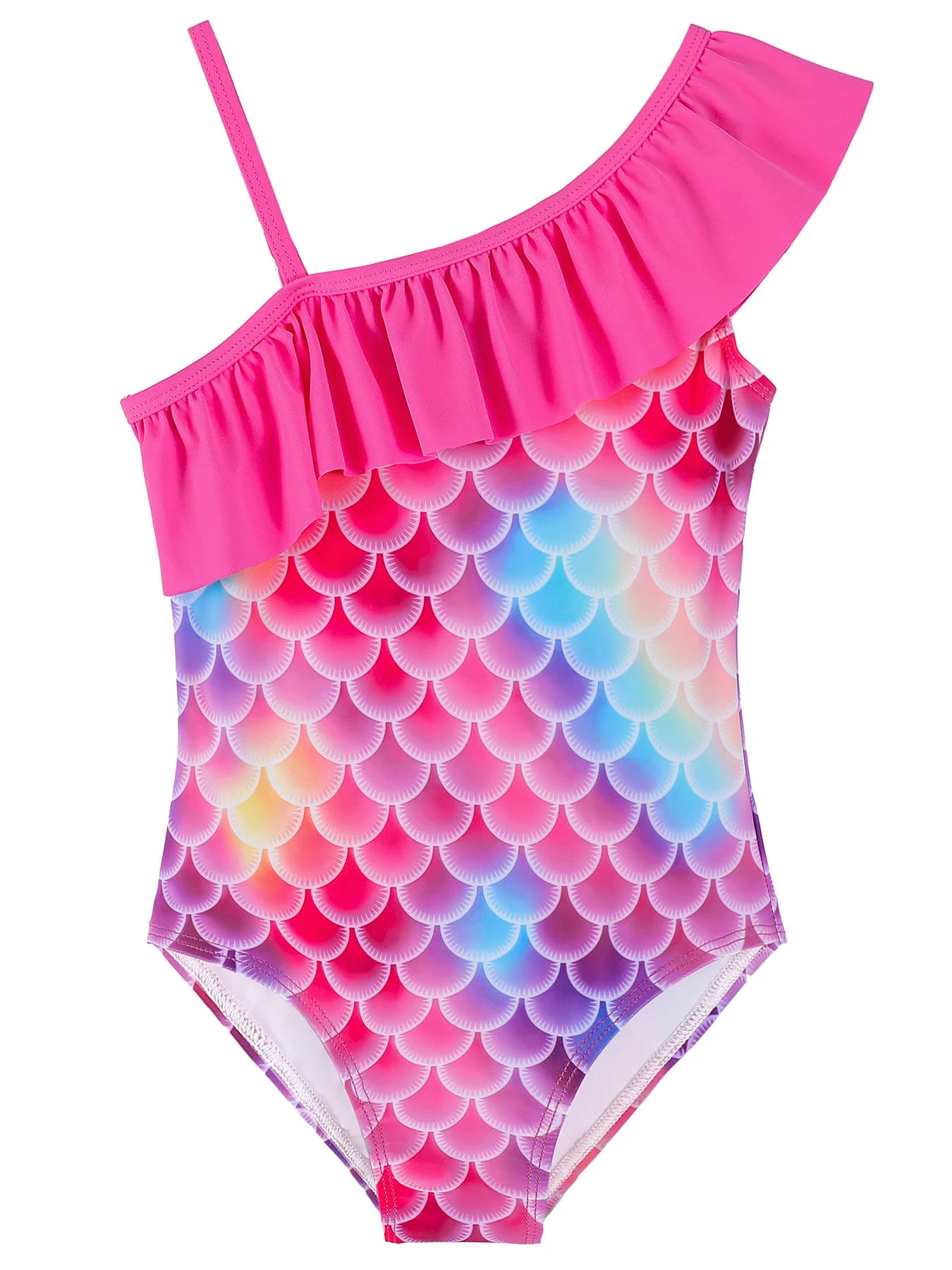 This stylish one-piece swimsuit combines fashion with function for young swimmers. The asymmetrical one-shoulder design with delicate ruffle detailing creates an eye-catching look, while the 3D scale pattern adds texture and visual interest. Crafted for comfort and durability, it's perfect for pool days, beach outings, and summer adventures. The secure fit ensures confidence in the water, making it an ideal choice for active kids who want to look great while they play.