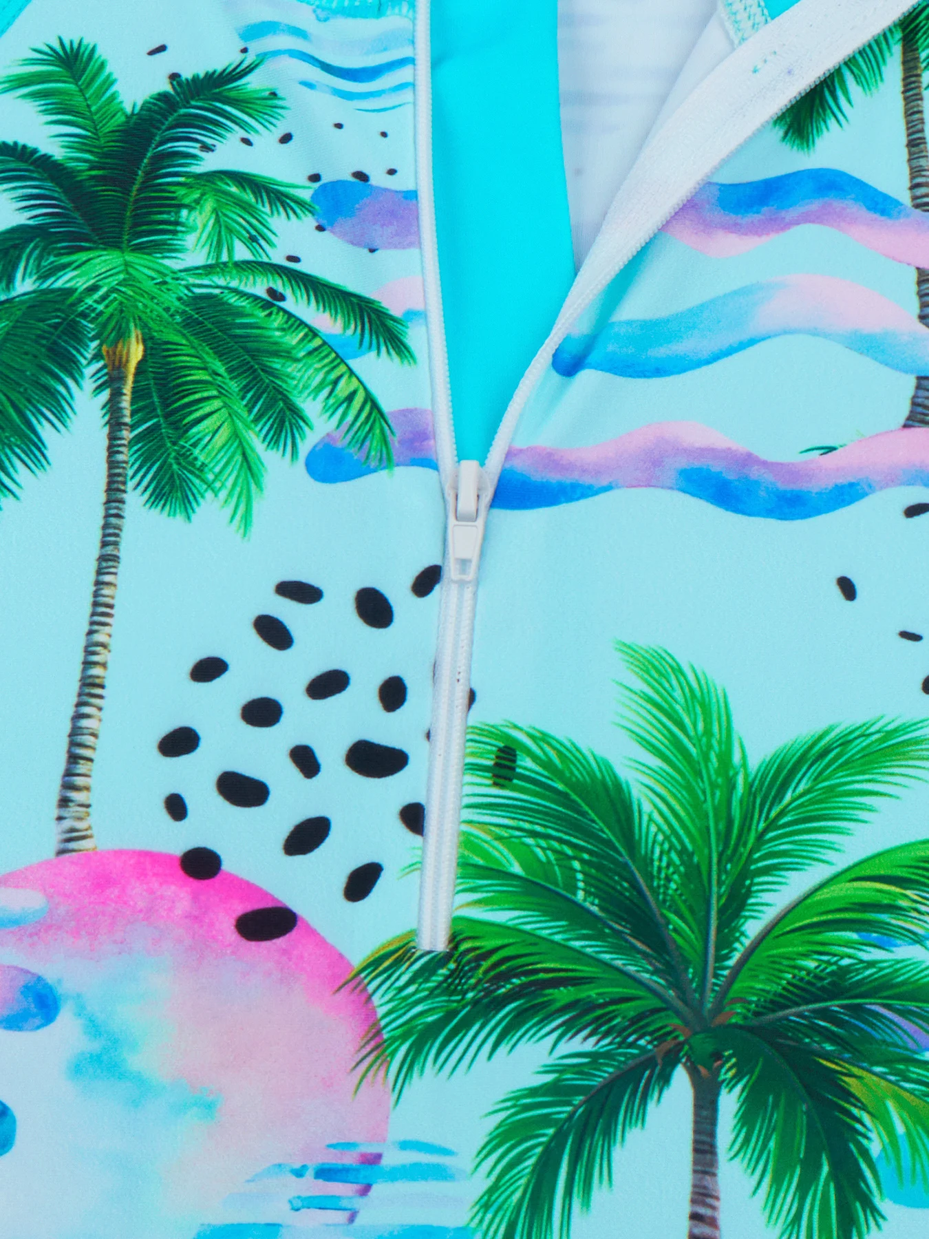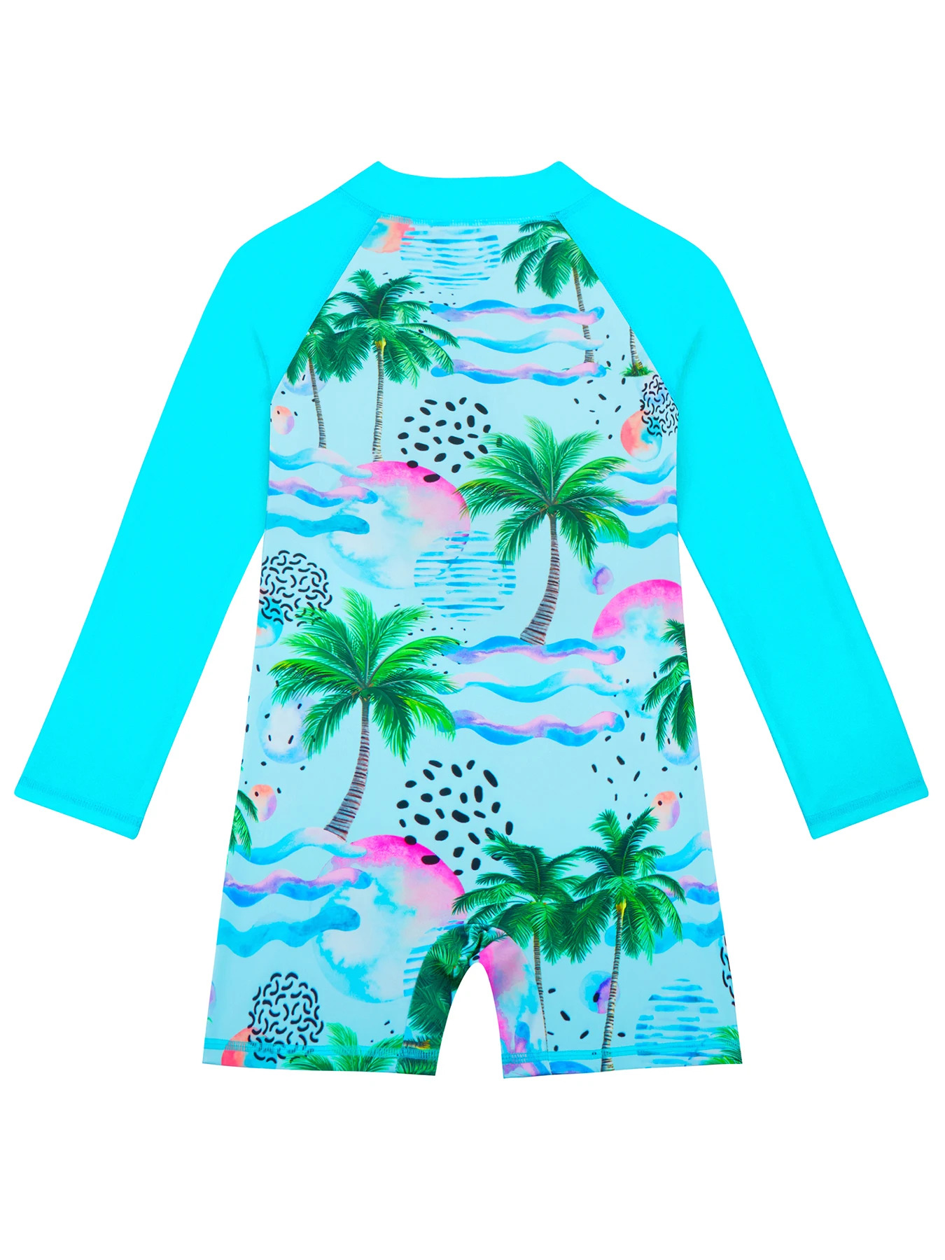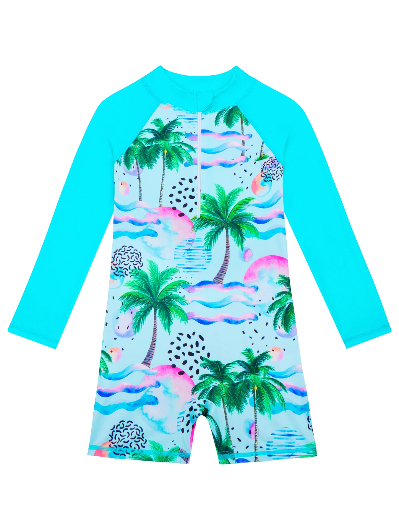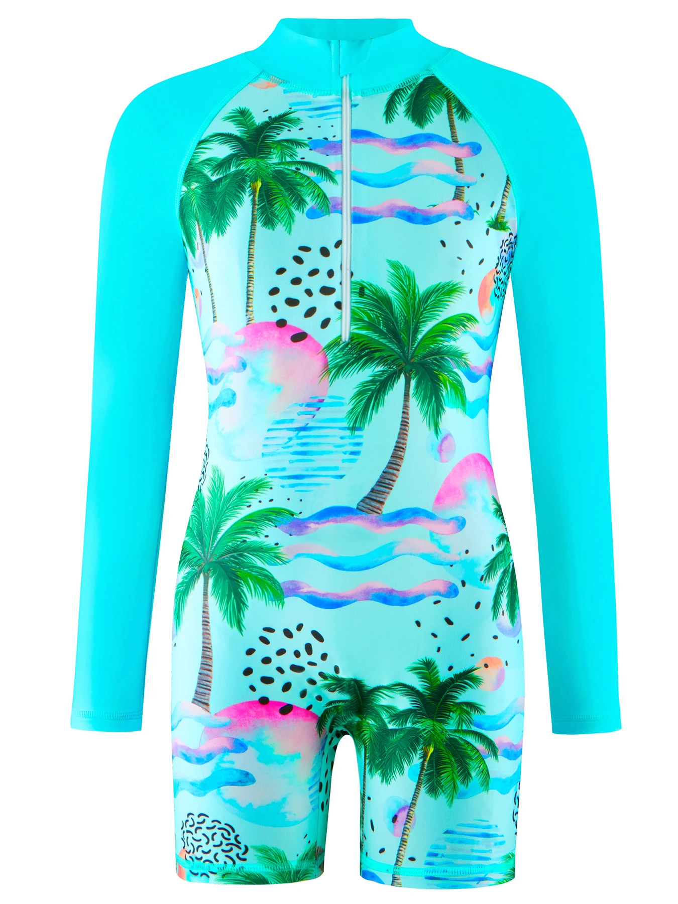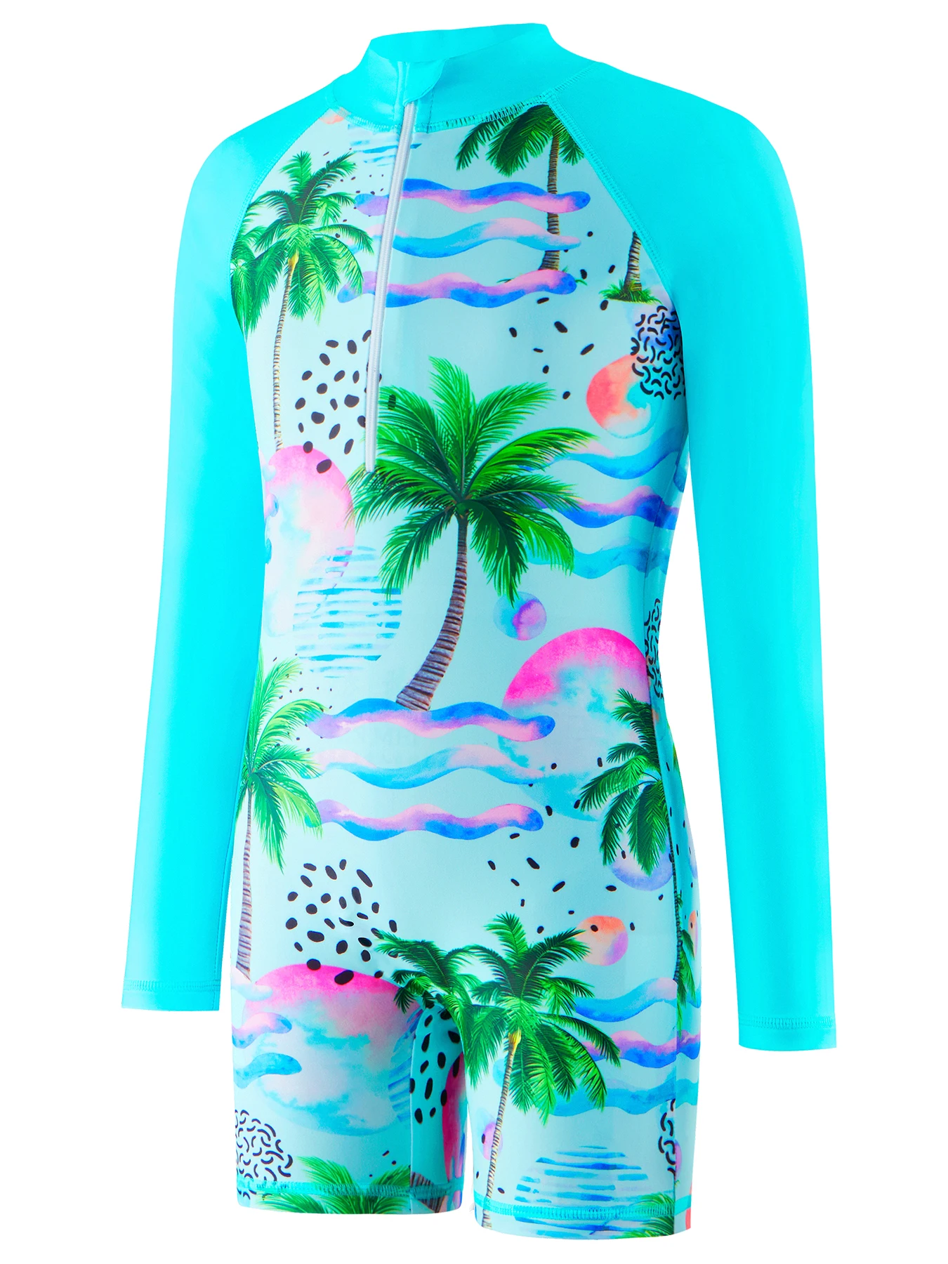 This one-piece girls swimsuit combines style with practical sun protection, featuring a vibrant plants and trees print that captures the essence of outdoor adventure. The long-sleeve design and boyleg shorts cut provide extended coverage, making it ideal for extended beach days and water activities. Built as a rash guard, it shields young swimmers from UV rays while allowing unrestricted movement in and out of the water. Perfect for family holidays or casual poolside wear, this versatile piece transitions seamlessly from beach to resort settings. Durable construction ensures it withstands regular swimming and chlorine exposure, maintaining its colour and fit season after season.