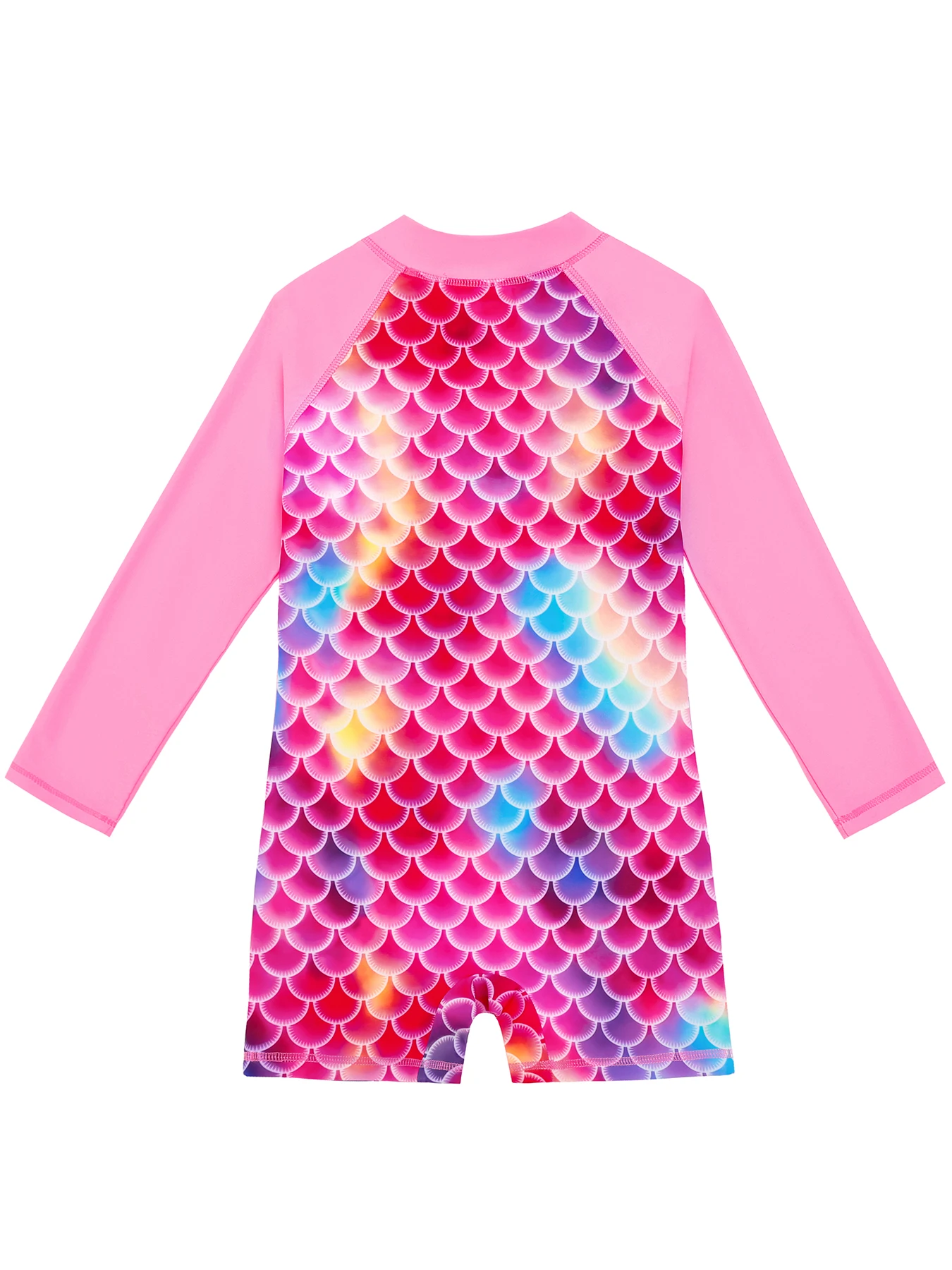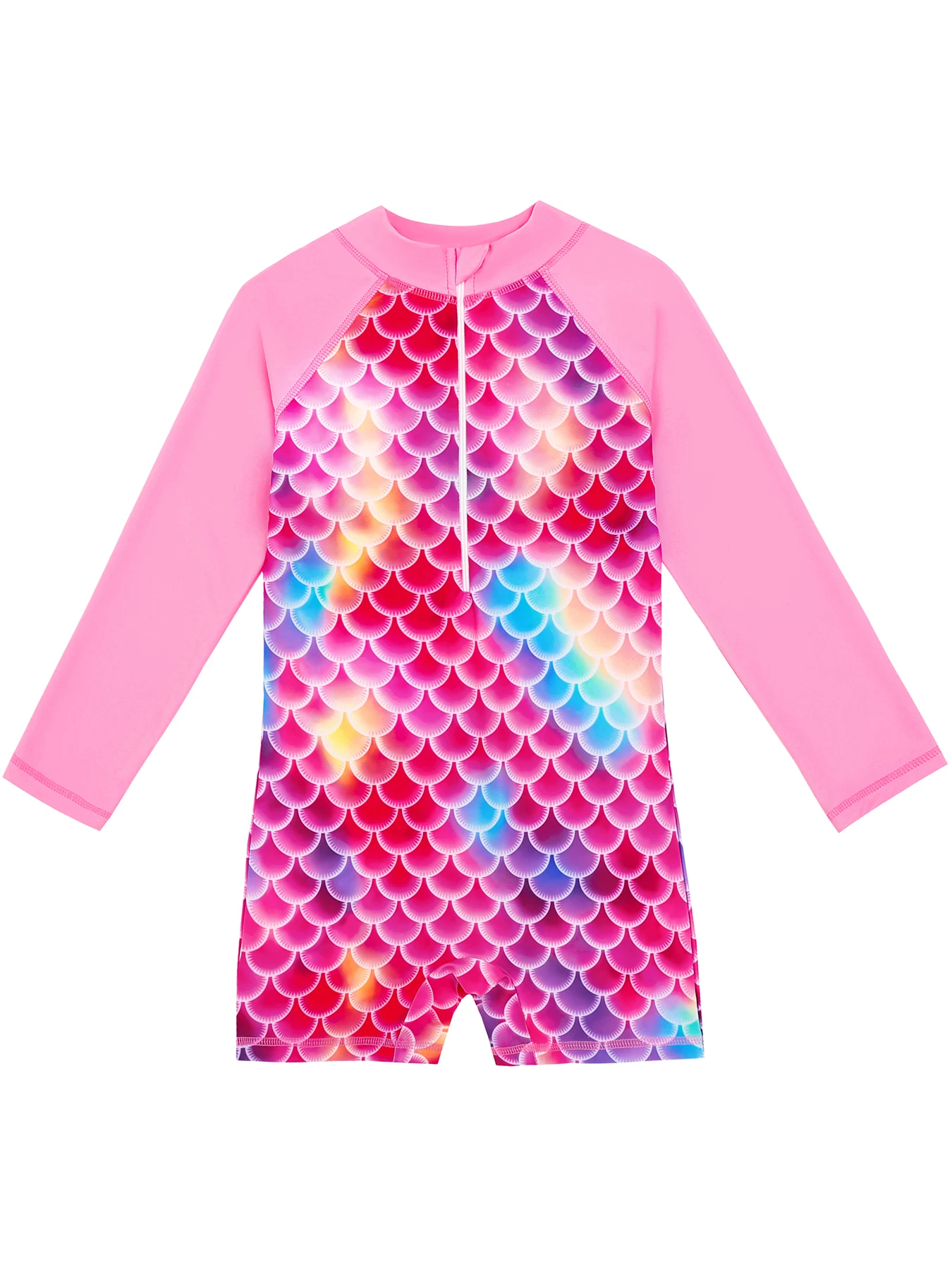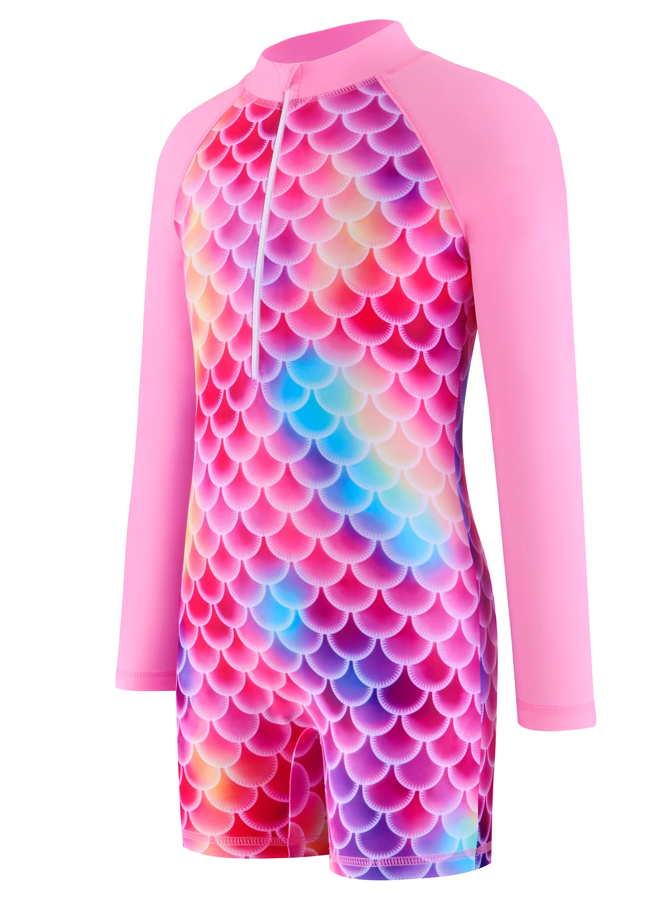 This one-piece swimming suit combines practical design with eye-catching style for young swimmers. The boyleg shorts cut provides comfortable coverage and freedom of movement in the water, while long sleeves offer extended sun protection during beach days. The vibrant 3D scale print in pink creates an engaging visual appeal that kids love. Crafted for durability and chlorine resistance, this swimwear is ideal for pool sessions, beach outings, and summer water activities. Easy to care for and built to withstand regular use, it's a reliable choice for active young swimmers.
