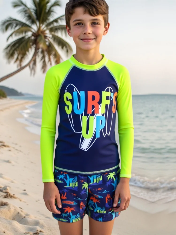 Keep your young swimmer protected and stylish with this vibrant boys' swimsuit featuring a playful coconut tree and letter print design. The long-sleeve construction offers enhanced sun protection for extended beach days, while the comfortable fit ensures freedom of movement in and out of the water. Perfect for summer holidays, pool parties, or casual seaside adventures, this durable bathing suit combines practical functionality with eye-catching tropical aesthetics that kids love.