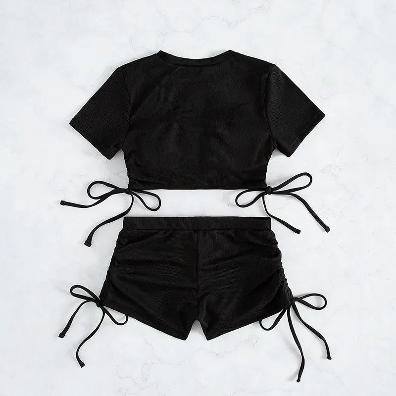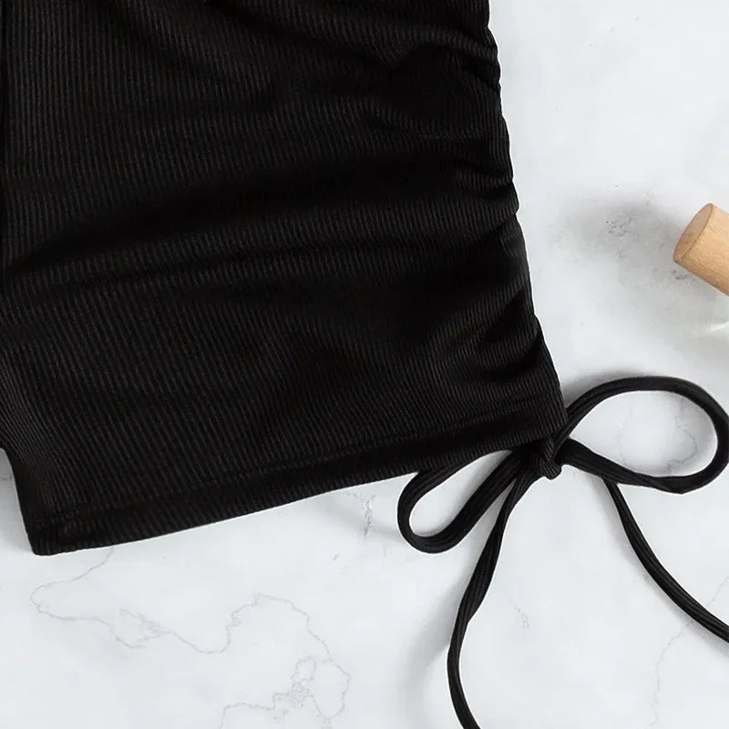 Crop Top Shorts Bottom Swimsuits Women Black Drawstring Swimwear Ribbed Bikinis Set Bathing Suit Beach Wear Bikini Mujer Swim